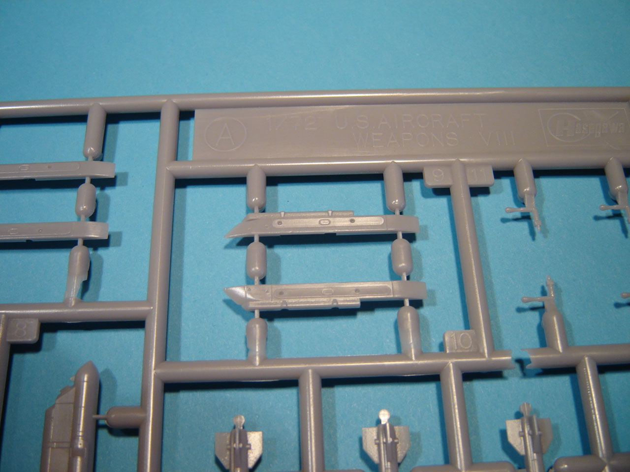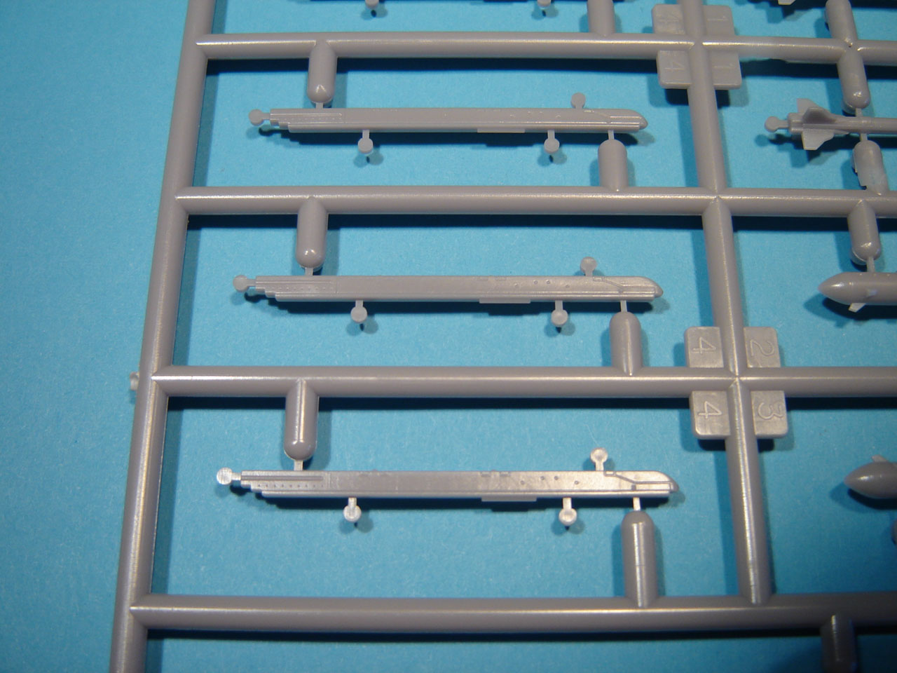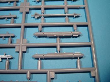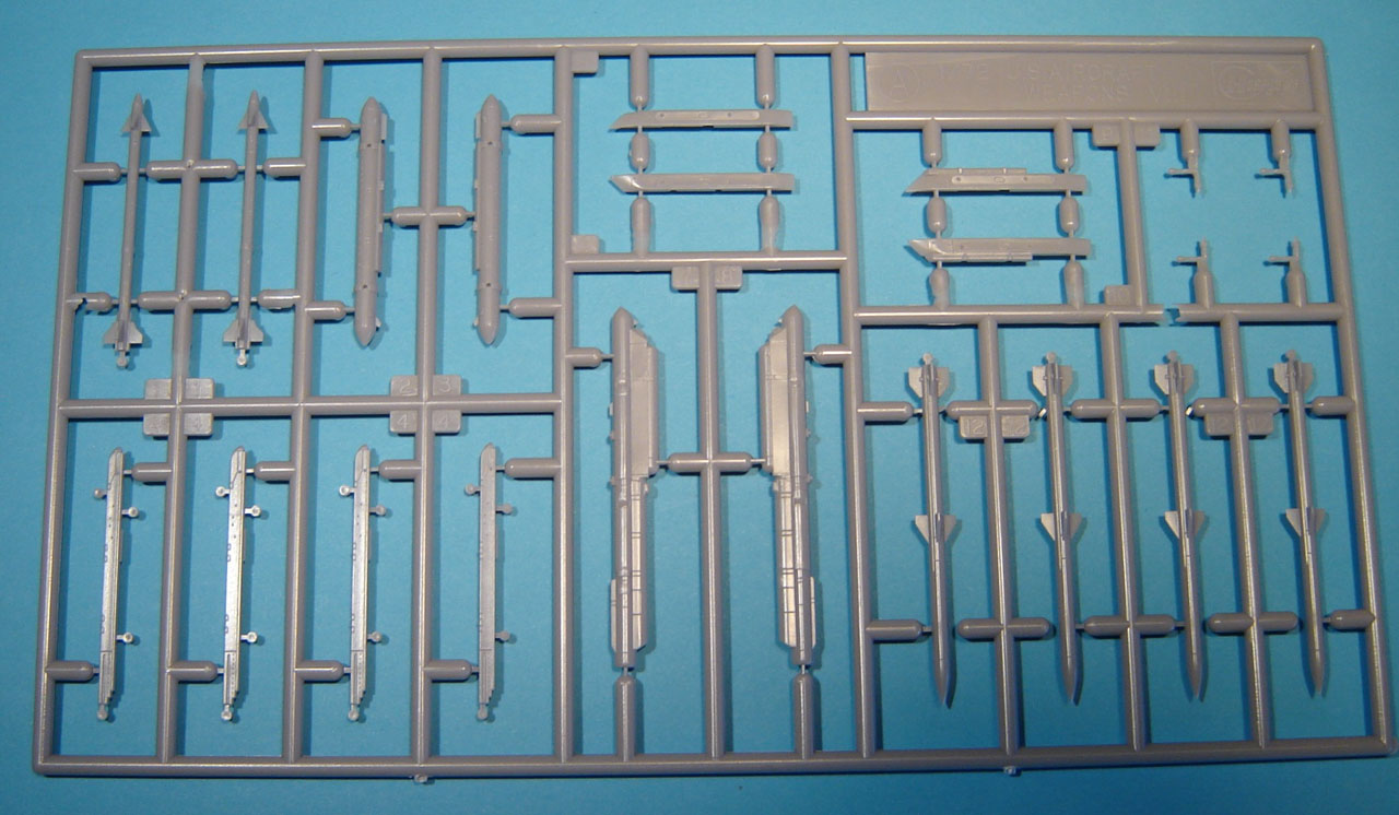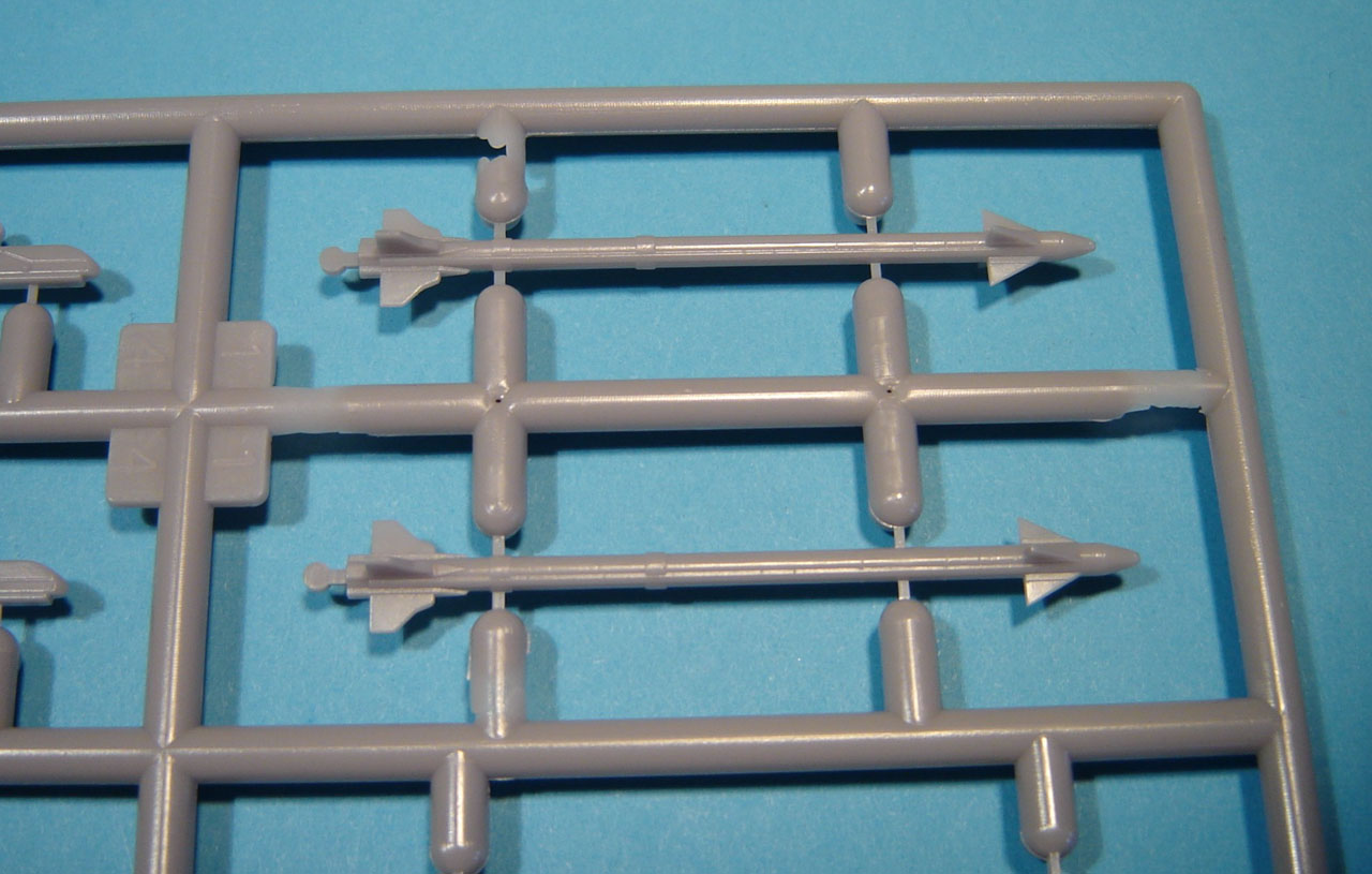 Voici une brève présentation en image de la nouvelle grappe. La qualité est au rendez vous : pièces bien nettes, fine gravure en creux, rivetage fin en creux. On appréciera des points d’éjection de la grappe très fins sur les missiles qui ne nécessiteront ni ponçage ni rebouchage, même si (comme d’ordinaire) les ailettes sont un peu épaisses pour l’échelle.