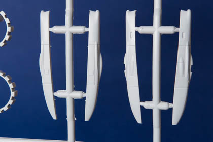 Par comparaison avec les modèles Hasegawa, la gravure est plus appuyée, moins fine, mais un léger ponçage au papier 400 à l'eau remédie sans problème, le plastique étant ni trop dur ni trop mou il est très agréable à travailler. La représentation des volets additionnels sur les entrées d'air n'est pas assez carrée à mon goût. Les tuyères ne sont pas évidées entre les cloisonnements. Je cite ces points en étant exigeant sur l'analyse mais honnêtement le kit dans sa globalité est vraiment très bon. La comparaison du kit avec différents plans n'a montré aucun défaut de formes ou de dimensions. Au moment où j'écris ces lignes le montage de la maquette est bien avancée et les assemblages n'ont posé aucun problème, pas de défaut d'alignement ni de zone à mastiquer en quantité.