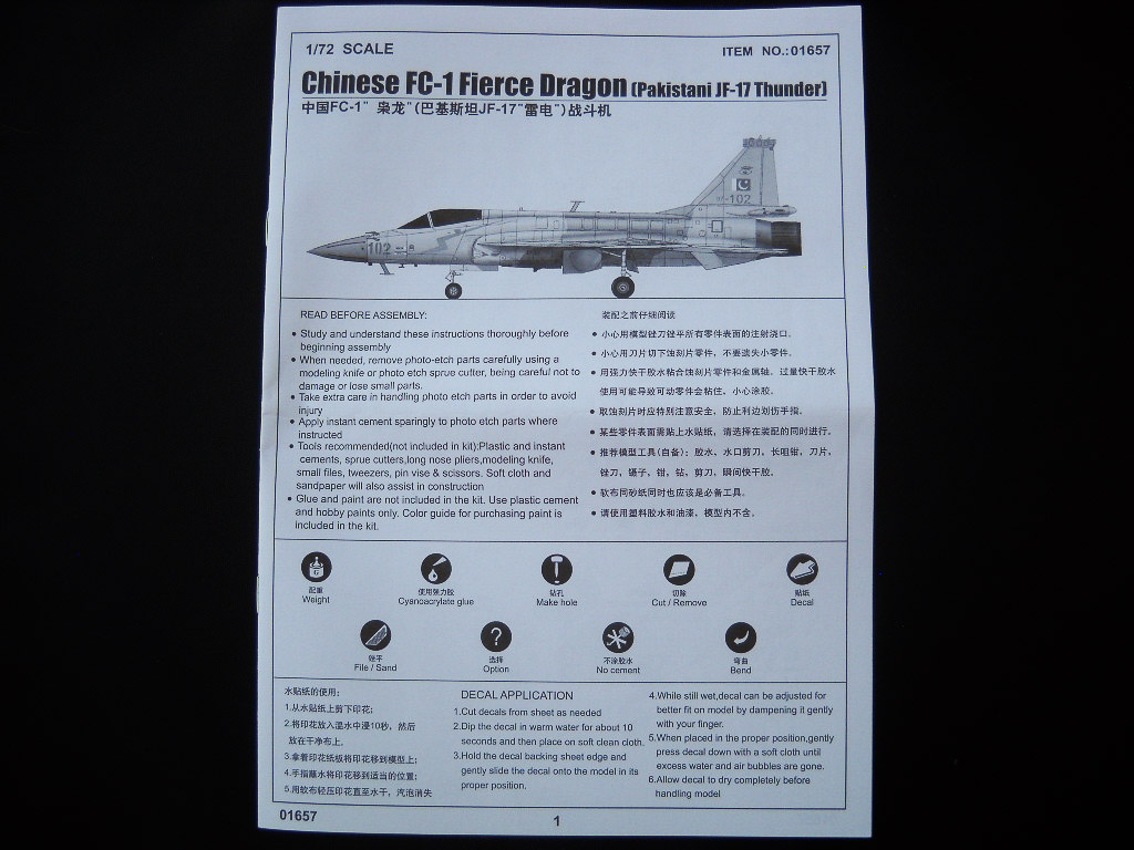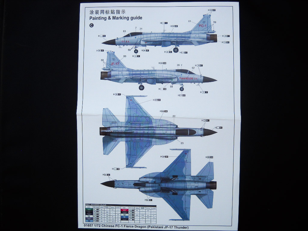 Vous aurez compris mon enthousiasme débordant qui ne fait pas secret d’une grande envie d’entreprendre le montage de ce kit dans les meilleurs délais. De plus, cet avion, au final assez peu connu, n’est pas dénué d’un certain charme. Actuellement en service au Pakistan, en projet en Chine, ces deux pays étant à l’origine du développement de cet appareil, de nombreux autres pays se disent intéressé par son acquisition parmi lesquels figurent la République Démocratique du Congo, le Nigeria, le Sri Lanka, le Soudan, le Venezuela, la Turquie et la Serbie. Donc un potentiel de décoration à venir pas inintéressant du tout… Dernier point, Trumpeter a produit deux boites de ce kit ; celle-ci est référencée 01657. Je ne saurais vous dire si le contenu plastique est identique avec celui de l’autre boite (réf. 01658), mais une chose est sûre, cette dernière ne propose que les décorations des prototypes n°1 et 3. Alors, si vous fuyez les décorations non opérationnelles, vérifier bien avant d’effectuer votre achat.