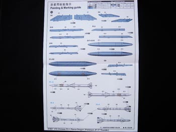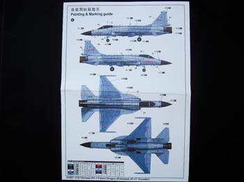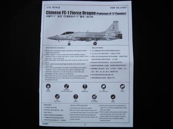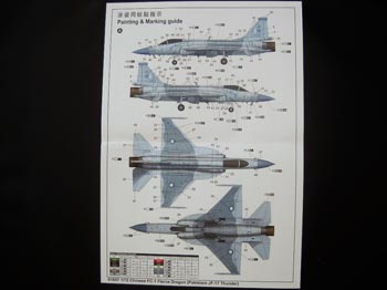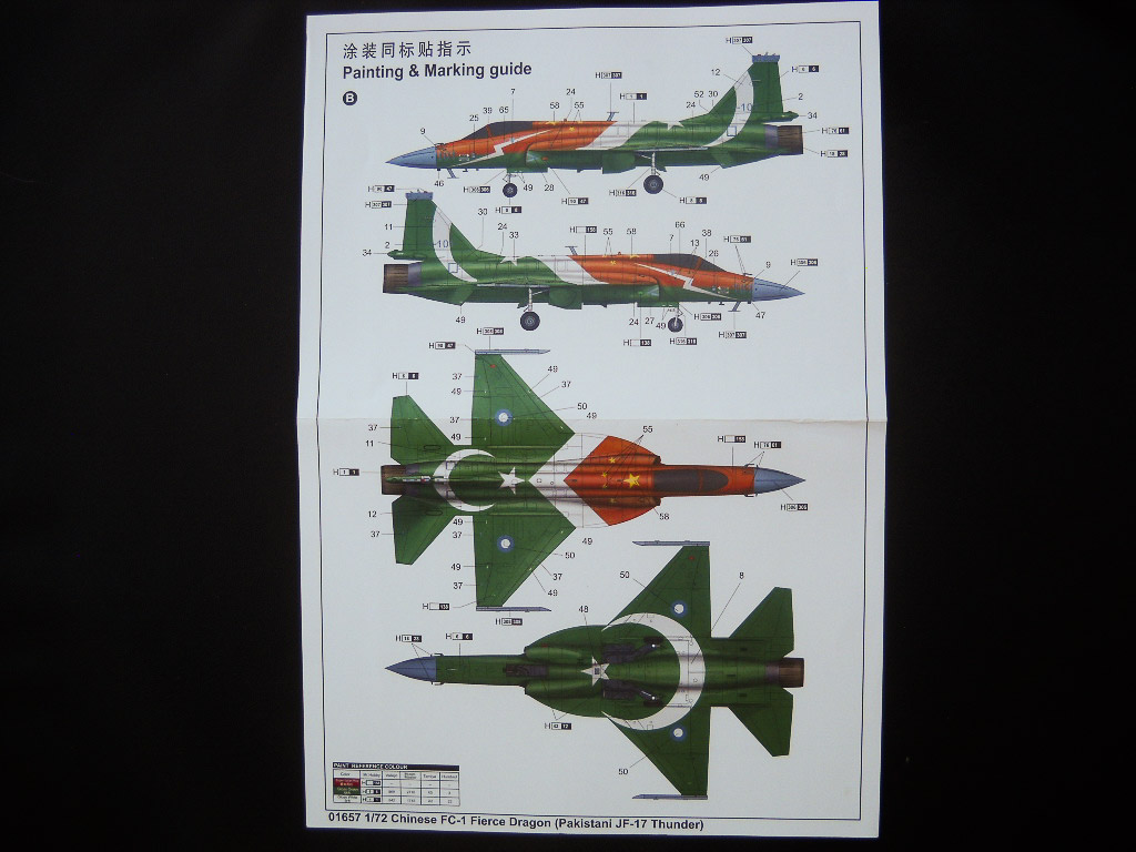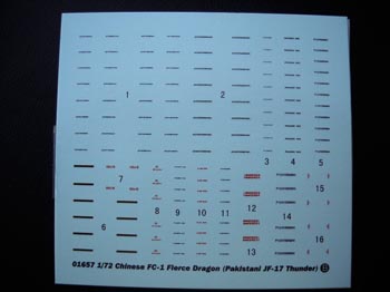 La petite boite pleine à craquer contient cinq grappes en plastique gris injecté à la gravure extrêmement fine, une en plastique transparent d’une finesse et d’une limpidité exemplaires, une plaque de photodécoupe et deux planches de décals, l’une regroupant toute une panoplie de stencils, l’autre étant plus spécialement axée sur les décorations proposées. En plus de cette gravure splendide, il faut ajouter que le niveau de détails est très élevé. Et le tout pour moins de 20 euros ! Qui dit mieux ? Trumpeter est décidément en constant progrès, même si au 1/72ème, la gamme proposée reste assez modeste. Le tout est accompagné d’une notice très claire et d’une représentation en couleur sur deux feuilles en papier glacé des décorations proposées : trois appareils aux couleurs pakistanaises, un appareil de pré-série, un autre opérationnel et un troisième haut en couleurs, puisque porteur d’une splendide livrée vert/rouge/blanche reprenant les couleurs nationales de ce pays. Ces décalcomanies sont parfaitement imprimés…