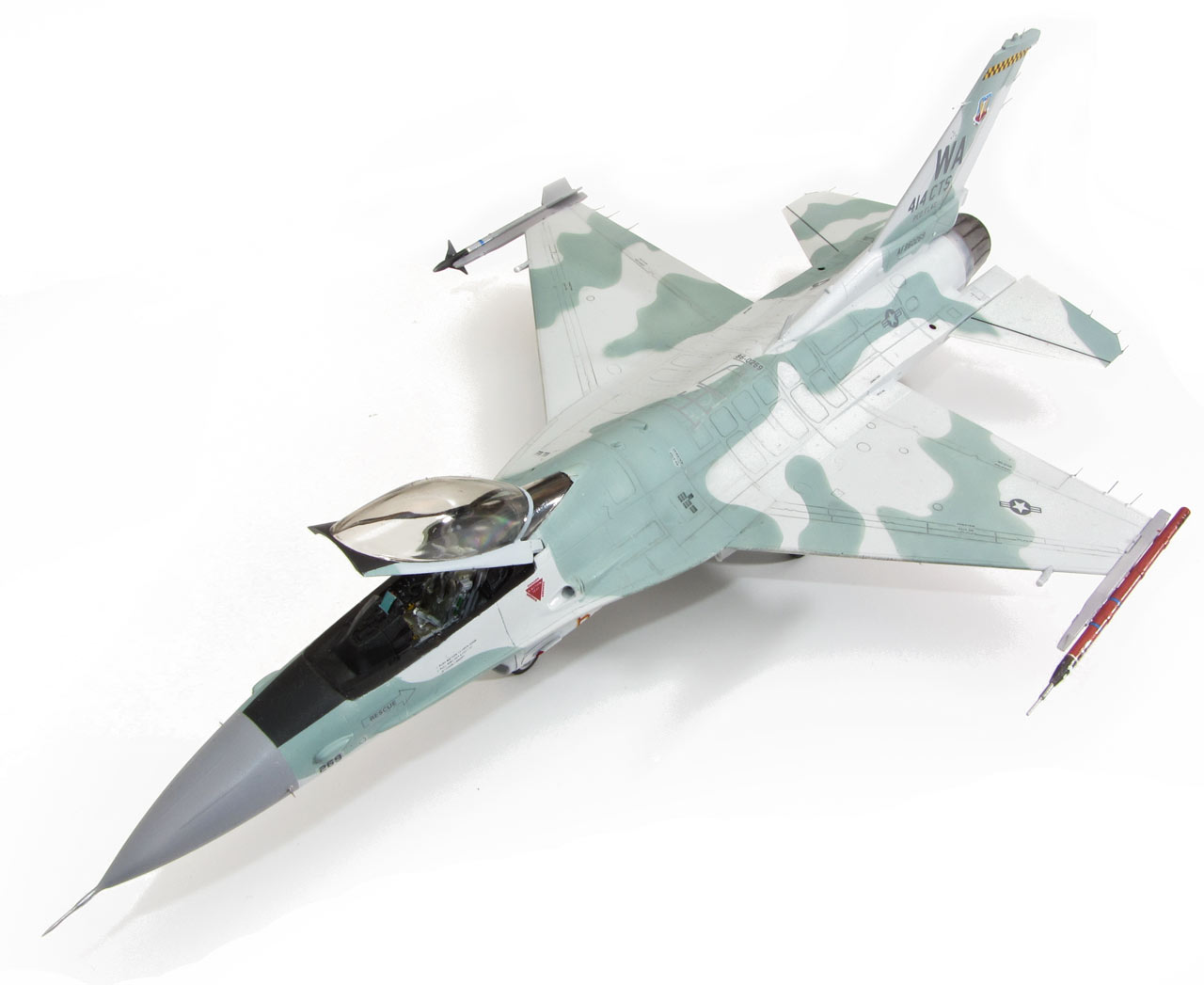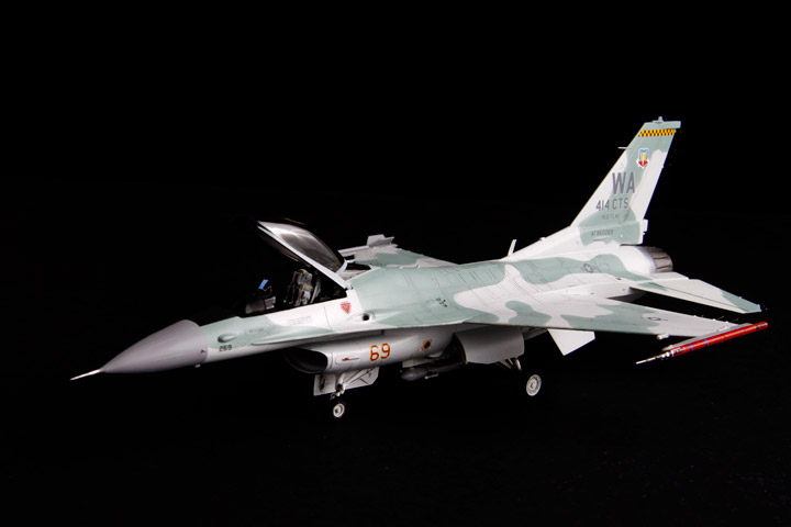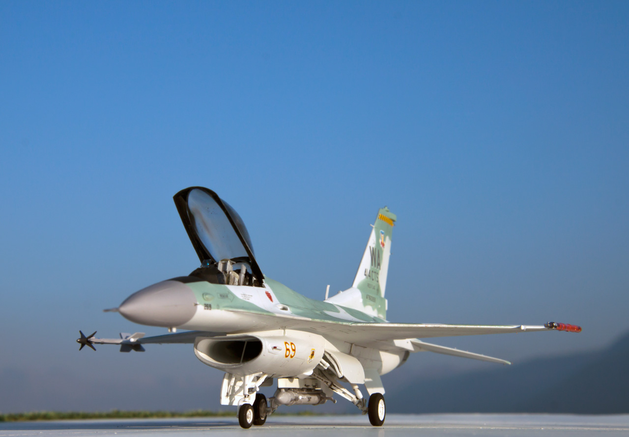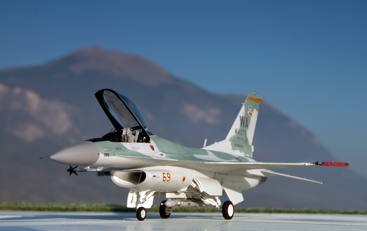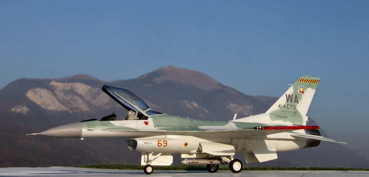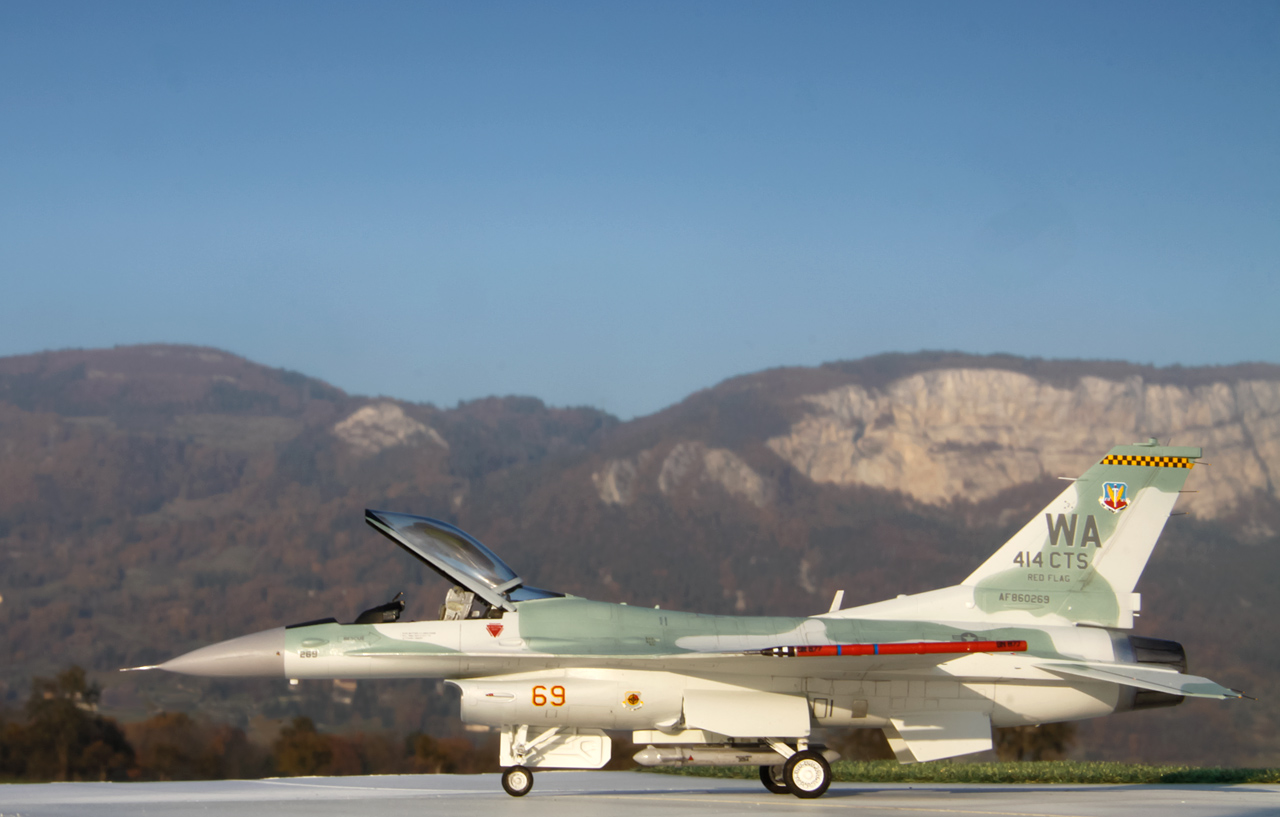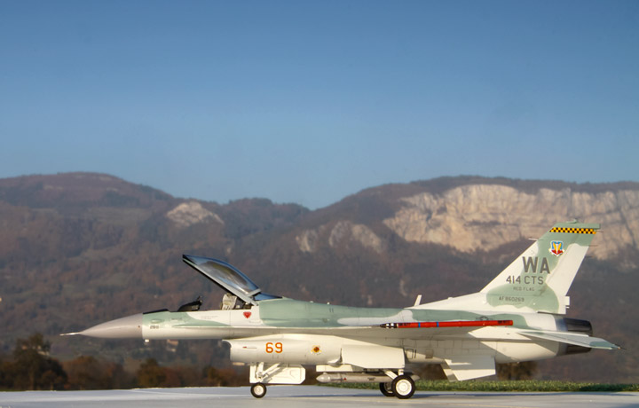General Dynamics F-16C Viper "AGGRESSOR" 414 CTS NELLIS AFB 1999 Maquette Revell 1/72 Bientôt 10 années que le kit Revell est sorti et je n'avais encore jamais monté ce kit. Le but de ce montage était de comparer ce kit avec les maquettes Academy et Hasegawa. J'ai beaucoup apprécié ce kit, il offre de nombreuses possibilités de versions, le montage est facile les détails et la gravure sont fins et précis. Le point négatif étant l'entrée d'air qui demande un peu de travail. - Peinture Gunze et Tamiya, vernis mat Pebeo