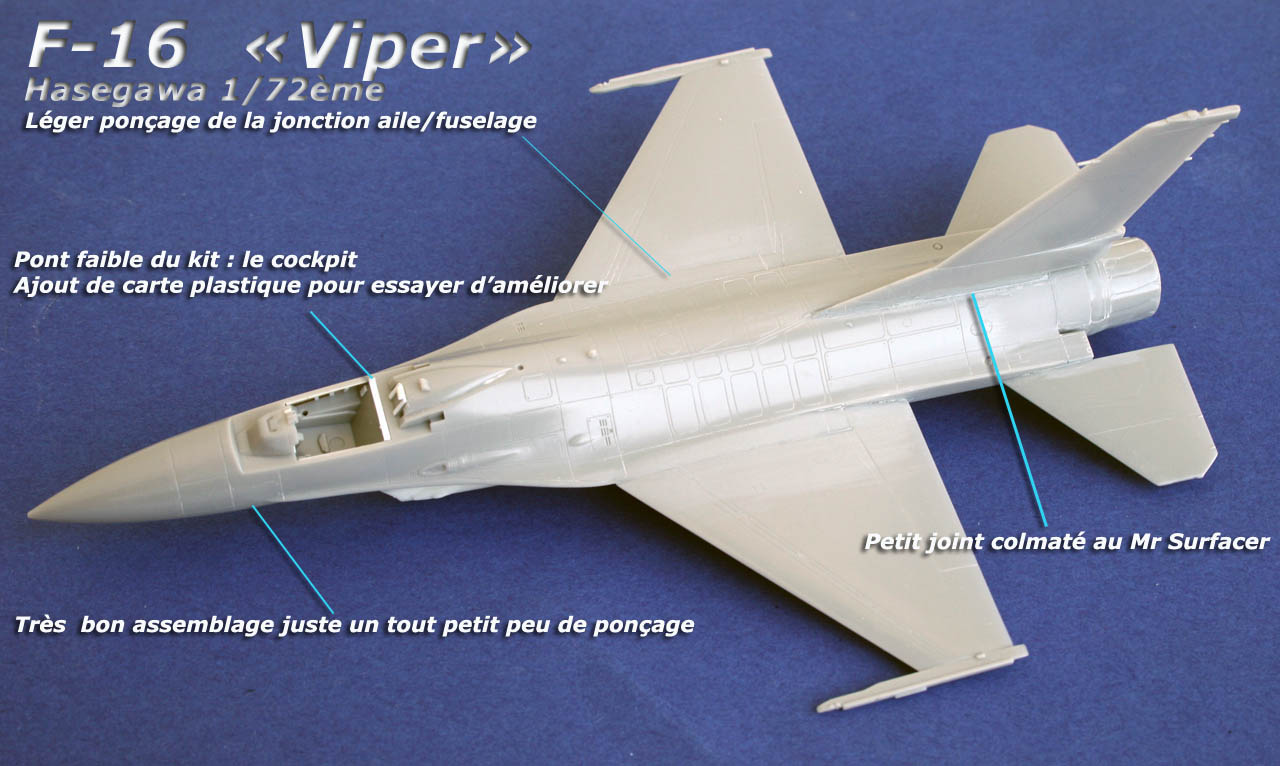 Étant très porté sur le F-16 ces derniers temps, avec la sortie du nouveau kit Academy, je me suis replongé dans le thème en étudiant les kits Hasegawa, Revell et le tout nouveau Academy; il me tardait d'en refaire une maquette. N'ayant pas trop de souvenirs de ce kit Hasegawa (j'avais monté, il y a quelques années, la version Brakeet F-16D de chez Hasegawa avec pas mal de travail dû à l'adaptation du dos en résine),j'ai donc choisi à nouveau le kit Hasegawa pour voir vraiment de quoi il en retourne. Le kit s'avère très simple et très facile à assembler. J'ai longuement comparé ce kit avec les kits plus récents de Revell et d'Academy et le kit Japonais n'a pas à rougir de son âge, il s'agit d'un bon kit.