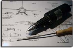 Pour poncer dans les endroits difficiles comme c'est le cas ici entre la partie supérieure plate de l'entrée d'air et le fuselage, je confectionne des cales à poncer avec du Rhodoïd de récupération (emballage) j'en découpe un rectangle de 2cm x 4cm environ, puis je colle à la cyano un morceau de papier abrasif à l'eau grain 400, ensuite il est très facile de poncer avec cette petite cale. On peut se confectionner des cales à poncer à volonté, de la taille que l'on souhaite et ainsi du gagner du temps avec les opérations de ponçage qui sont parfois fastidieuses. Mais ça n'est pas le cas sur ce F-16, puisque le ponçage est vraiment minime.