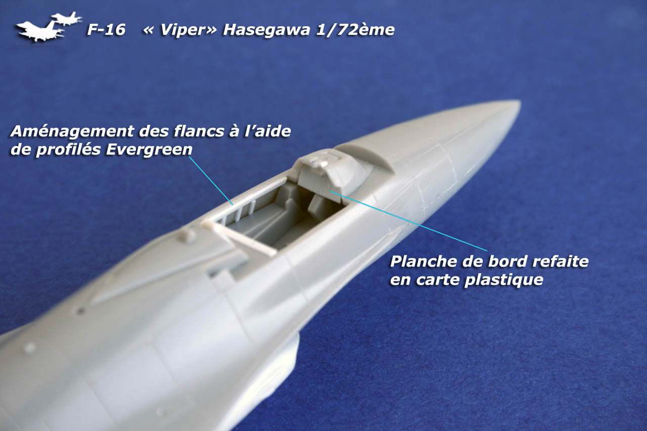 J'ai directement assemblé le cockpit avec la planche de bord dont j'ai refait la partie supérieure qui est trop petite d'origine. J'ai ajouté quelques éléments en carte plastique sur les flancs et à l'arrière du cockpit.