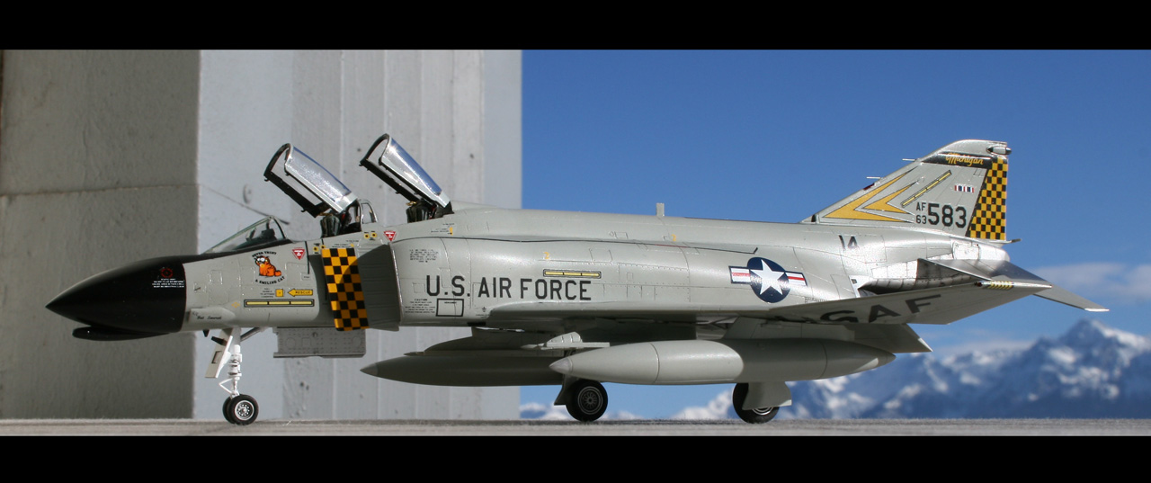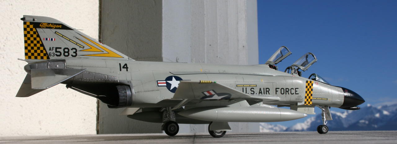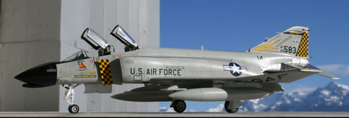La maquette Hasegawa a été produite au début des années 90, la gravure en creux est très fine, les trains d'atterrissage sont joliment moulés. La gamme Hasegawa propose la plus grande gamme de Phantom au 1/72ème. Les versions suivantes ont été produites : F-4B F-4C F-4D F-4E F-4EJ F-4EJ "KAI" F-4F F-4G F-4J F-4N F-4S RF-4B RF-4C RF-4E. Le nombre de décoration et de réédition du kit est conséquent puisque des dizaines de déco ont été produite. Hasegawa a bien reproduit les formes de l'appareil, ont peux cependant reprocher que certaines parties ne soient pas reproduites de façon mobiles, comme les volets, les trappes de refroidissement moteur, ces parties étant presque toujours en position abaissés lorsque l'avion est au parking. Le manque de détail dans le cockpit est aussi un petit défaut de la maquette qu'il faudra corriger si l'on représente la maquette avec les canopées ouverte.