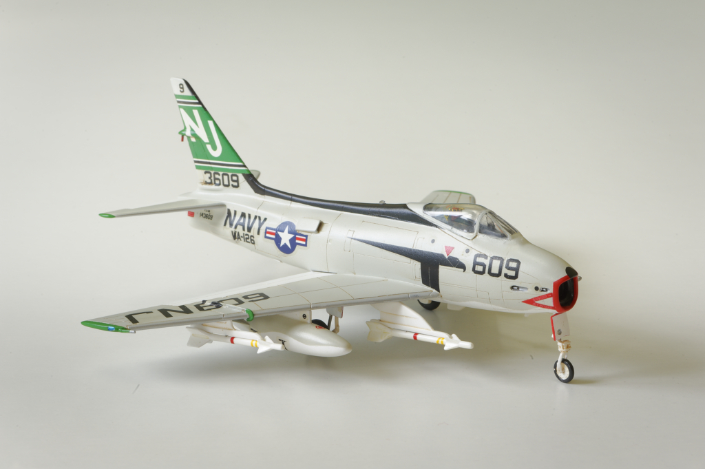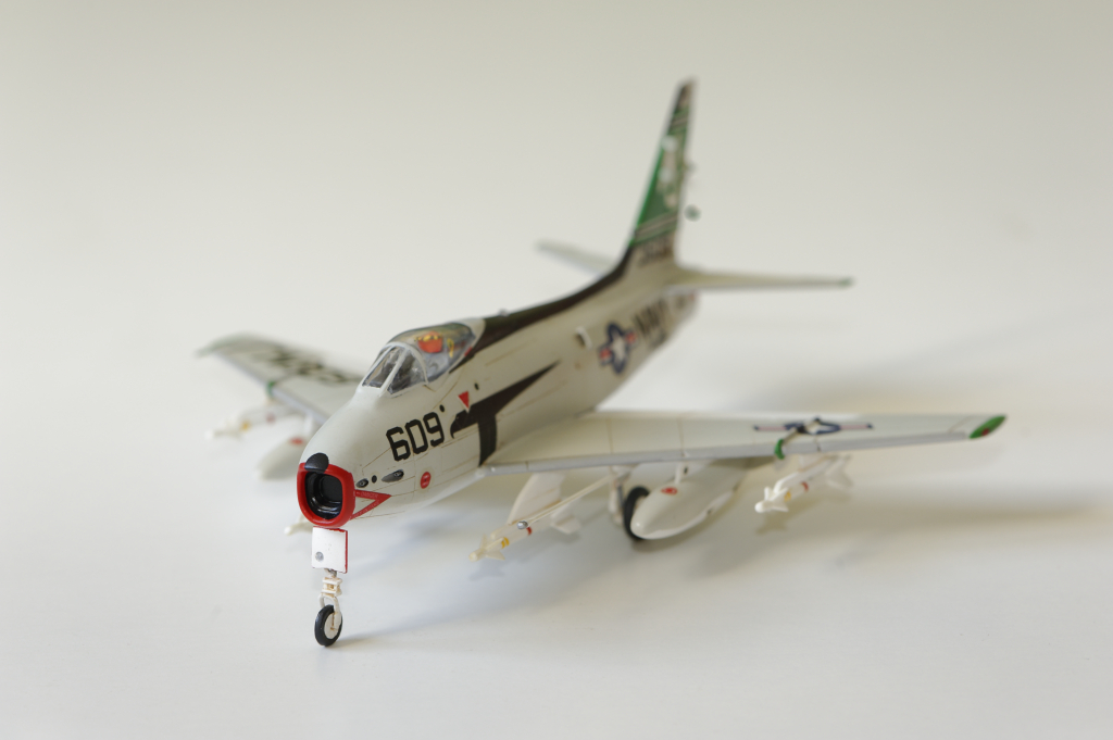 Conclusion : Une maquette à ne surtout pas offrir à un débutant vu la difficulté du montage. Le train d'atterrissage au final semble bien supporter le poids de la maquette. Il faut prévoir un renforcement systématique des équipements externes (corde métallique) et ne surtout pas oublier un lest à l'avant. Après une période de découragement, je suis quand même satisfait du résultat obtenu. C'est le seul FJ-4 disponible aujourd'hui au 1/72ème et je trouve qu'il a fière allure en attendant une maquette plus moderne.