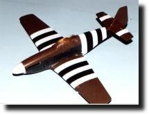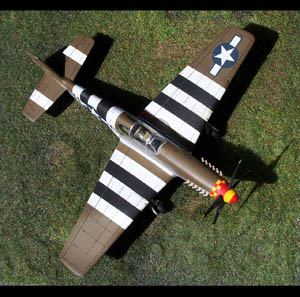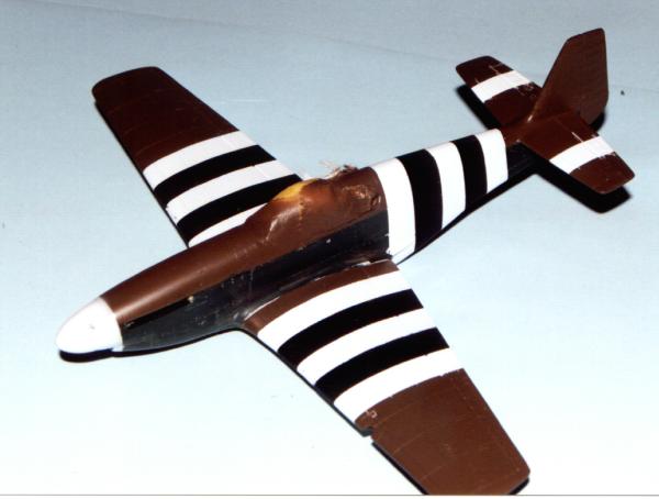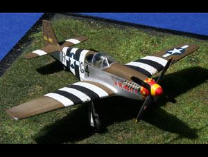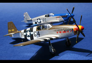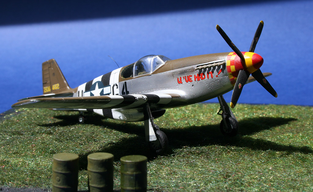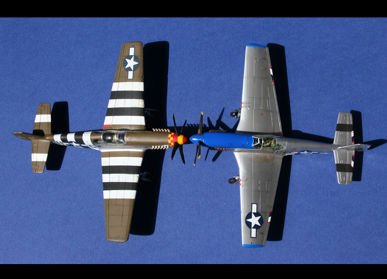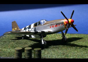 détail est invisible. Les deux parties formant le fuselage sont assemblées sans aucune difficulté. La voilure s'assemble également sans difficulté. Par contre le bord de fuite est épais, il est affiné avec une cale à poncer. L'empennage s'assemble à la perfection. La partie avant et la casserole d'hélice demandent du travail pour parfaire l'assemblage. La verrière fournie dans le kit est inutilisable, aussi elle est remplacée par la verrière thermoformée Squadron. Prévue à l'origine pour le kit Hasegawa, la verrière demande un important travail pour sa mise en place, le plastique thermoformé ne facilitant pas l'opération. La verrière est collée avec de la colle cyanoacrylate de la marque Loctite celle-ci ayant l'avantage de ne pas ternir le plastique transparent, à condition d'être raisonnable sur la quantité de colle. Tous les joints sont comblés avec le produit Mr Surfacer Gunze, puis poncés au papier abrasif à l'eau, en commençant au grain 400 jusqu'au 1200. La maquette est ensuite soigneusement nettoyée à l'eau savonneuse. Le mustang est ensuite poli au coton avec la pâte à polir Clear Vax. La maquette est de nouveau nettoyée. La maquette est maintenant prête pour la mise en peinture. Tous les masquages sont réalisés avec le ruban Tamiya