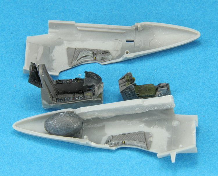 Le montage est standard et il suffit de suivre la notice de montage. Aucun piège à éviter en la matière. Simplement, souhaitant détailler le cockpit, j’ai ajouté un cockpit résine + photodécoupe de marque Aires. Celui correspond à une très grosse amélioration par rapport aux pièces fournies par Fujimi mais demande quelques efforts d’ajustement pour intégrer le cockpit dans la pointe avant de la maquette. Un cockpit de Skyhawk c’est particulièrement étroit et un retrait de matière sur les pièces plastiques aussi bien que sur la pièce en résine a été nécessaire.