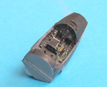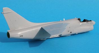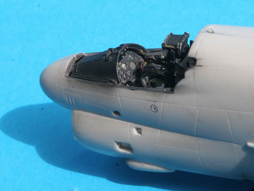 Le premier point à traiter est le cockpit. Tel quel, le cockpit Fujimi est trop simple et comprend d'ailleurs des inexactitudes au niveau des cloisons verticales derrière le pilote. Cette zone sera donc entièrement reprise en incluant un cockpit en résine Aires, très détaillé et très fin. En revanche, comme j'en ai fait l'expérience sur tous mes projets récents incluant des cockpits en résine de la marque, les ajustements nécessaires pour inclure ces petits bijoux de détails, sont énormes. Il faut alors supprimer TOUTE la matière possible sur la maquette et sur le set résine jusqu'à obtenir des pièces translucides par endroits. Ce travail est probablement le plus déplaisant du projet, même si le résultat final est très satisfaisant et très enrichissant.Le cockpit est peint en gris moyen FS36231, commun aux cockpits américains. Attention les A-7E grecs sont issus des stocks tardifs d'avion de l'US NAVY et sont équipés de sièges éjectables SJU-8 et non des Escapac qui étaient installés dans les A-7H grecs et A-7 antérieurs de l'US NAVY. |