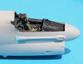 Une fois ces améliorations apportées sur le cockpit et les trains d’atterrissage, le montage peut être simplement entamé, en suivant la notice. La seule petite incartade est le montage des entrées d’air. En effet j’ai préféré fixé chaque demi entrée d’air sur le demi fuselage correspondant, afin de faciliter les ajustements, alors que Fujimi propose de monter le fuselage d’abord, puis d’y fixer les demies entrées d’air. Les demis fuselages étant complétés, le cockpit en résine est ajusté avant collage à la colle cyanolite pour fixation rapide, renforcé par de la colle bi-composant pour la solidité. Un plomb de pêche est fixé dans la cône radar avant fermeture du fuselage.
