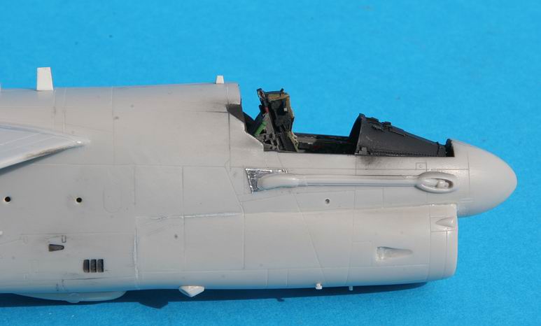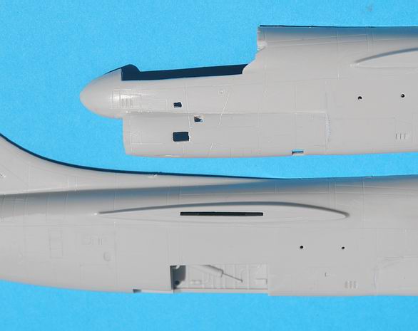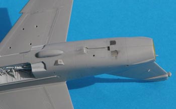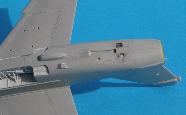 Ayant décidé de monter l'avion au sol et échelle déployées, un certains nombre de "trous" sont creusés dan le fuselage, au niveau des marches d'accès et au niveau de la porte de purge du canon, généralement ouverte au sol.