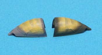 - Des tuyères de réacteurs qui sont peut être l’expression la plus évidente du traitement dilettante d’Hasegawa de cette maquette. Ces pièces nécessitent un véritable travail consistant à creuser et affiner les sorties d’air du réacteur avant de cloisonner les deux tuyères arrières. Les tuyères avant correspondent à l’éjection des gaz froids et sont normalement peintes dans les couleurs du camouflage de l’avion, tandis que les tuyères arrières correspondent à l’éjection de gaz chauds et sont métal brulé.