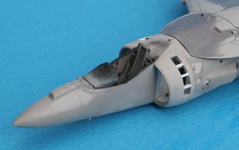 Les verrières sont collées ouvertes. Toujours de façon spécifique pour les Harrier, la petite échelle rétractable d'accès, situées à droite sous l'entrée d'air doit être confectionnée en plastique étiré. En effet dans la réalité cette échelle est connectée au système d'ouverture de la verrière et est obligatoirement descendue quand la verrière est ouverte.