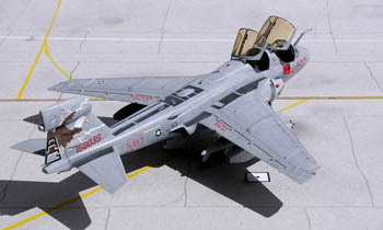 A ce stade les opérations de peinture peuvent commencer avec les couleurs traditionnelles des camouflages tactiques de l'US NAVY. Les couleurs principales sont les gris FS36375 (Light ghost grey) et FS36320 (Dark ghost grey). Quelques touches de gris bleu FS35237 et de gris mouette FS36440 ont été appliquées légèrement par endroits afin de reproduire les effets de réparations peinture de l'avion, si commusn aux avions de la marine américaine. Certaines peintures ont été altérées de pointe de blanc ou de noir pour traiter certains panneaux. Tout ceci est relativement discret puisqu'il s'agit de l'avion du CAG (Commandant du groupe aérien du porte-avions) en général un peu mieux entretenu que les autres avions de la flotte.