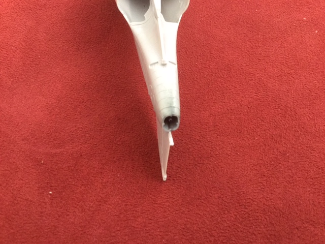 La peinture a été réalisée en commençant par le blanc (Tamiya XF2 puis Gunze 316). La dérive a été peinte en noir satiné (Gunze 65), la pointe radar en noir brillant (Tamiya X1) et la sortie des tuyères en divers tons d’Alclad.