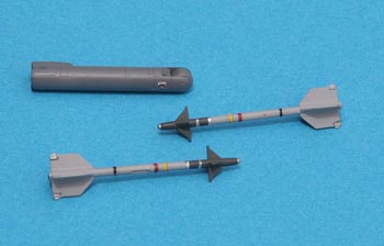 J'ai choisi une configuration de charge légère, constituée du pod LANTIRN fourni pas Hasegawa, de deux Sidewinder et du réservoir larguable ventral. Pour l'époque représentée, j'ai fait le choix des rails de missiles les plus modernes, compatibles avec les missiles AMRAAM. Ils sont fournis par Hasegawa et sont les rails à bouts ronds.