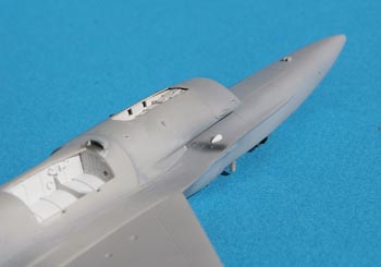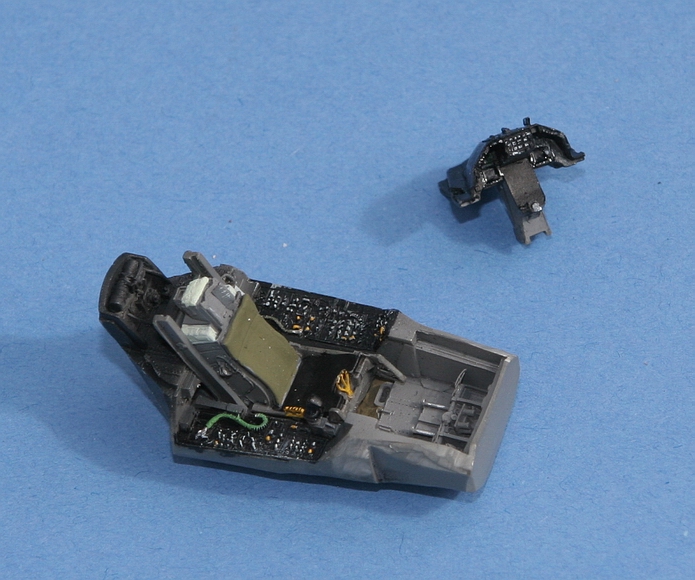 Pour le cockpit, le set résine est indubitablement une belle pièce. Malheureusement, comme quasiment systématiquement sur mes projets au 1/72e, l'insertion est une vraie douleur. Les opérations d'ajustage et d'affinage des cloisons de la maquette sont énormes. L'insertion se fait en affinant les épaisseurs de la maquette jusqu'à la quasi-transparence du plastique. A ce degré de finesse du plastique attention à toute goutte de colle à maquette qui potentiellement fondrait la maquette au moindre contact malencontreux. La peinture est habituellement en gris FS36231 pour le gros des surfaces, tandis que les consoles, casquette de planche d'instrument et tour du cockpit sont noirs. Les autres détails sont mis en couleur en évitant les touches trop vives de couleur qui donneraient un aspect de sapin de Noël (c'est de période) à votre cockpit, surtout en tenant compte que la maquette statique représente un avion à l'arrêt. Une fois cette opération réalisée on procède, après avoir inclus un lest dans le cône radar, à la fermeture du fuselage.