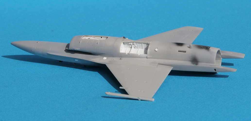 Le collage de la partie arrière et tuyère de réacteur complète le montage du fuselage principal. C'est le moment de procéder à une première opération d'ajustement des joints et de ponçage général en préparation des surfaces, avant que la mise en place d'autres pièces ne viennent géner le travail. Une fois cette action réalisée, la dérive, les ailes et les quilles peuvent être collées en place et ajustées.