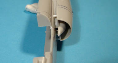 - A l’arrière du fuselage, les plus petites écopes (les plus en avant) sont accompagnées à l'arrière du long panneau horizontal, juste en dessous, d'une petite ventilation faite de quatre ouvertures obliques. Ces grilles seront figurées avec une décalcomanie de chaque côté de l’appareil. |