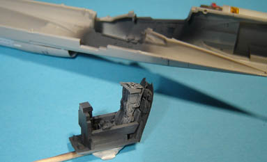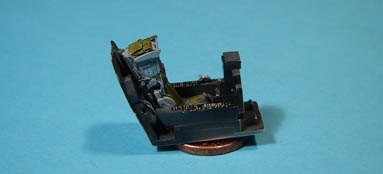 Il s'agit là d'un « gros morceau » sur ce montage car le cockpit d'Hasegawa est vraiment lisse et vide, tout est à refaire. Peu convaincu pas le set en résine proposé par pavla j'ai préféré « scratcher » ce cockpit autour d'un siège Mk10 en résine destiné au mirage 2000. J'ai conservé "le baquet" d'Hasegawa. La cloison arrière est sectionnée et refaite en carte plastique / evergreen /chutes diverses. |
