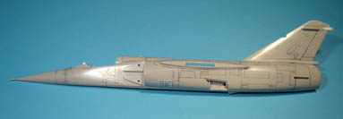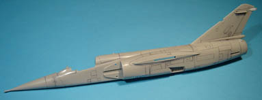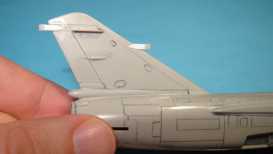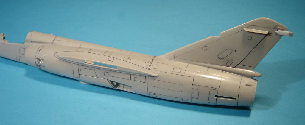 L'empennage vertical est entaillé pour recevoir les antennes du système Aigle. Elles seront scratchées dans l'extrémité d'un rail de missile de la boîte à rabiot. |