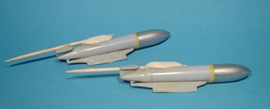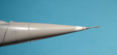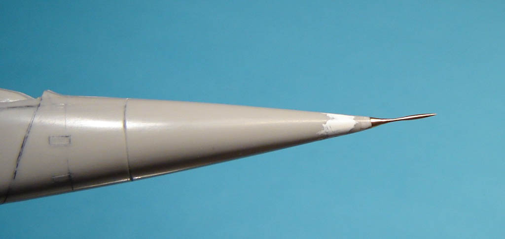 Les antennes "Aigle" sont réalisées à l'aide de l'extrémité d'un rail lance-missile issu de la boîte à rabiot. L'antenne est épaissie avec de la carte plastique, le tout est mis en forme par ponçage directement sur l'empennage vertical entaillée à l'emplacement des antennes initiales rondes proposées par Hasegawa. Un peu longue sur la photo, j’ai dû les raccourcir. |