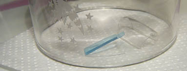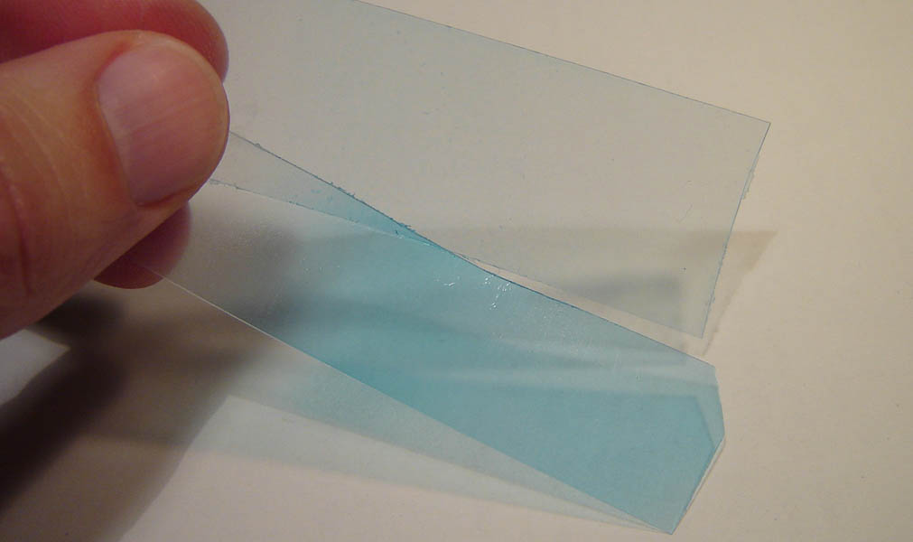 J’ai découpé des morceaux de pochette transparente et j'ai appliqué le bleu translucide Tamiya avec le diluant de la marque (dans différentes dilutions pour pouvoir faire des essais).Un rectangle aux bonnes dimensions est découpé et posé sous le pare-brise tout juste sorti de son bain de klir. |
