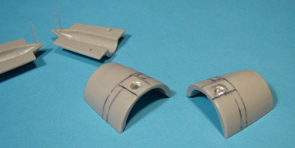 A leur tour ailes et stabilisateurs sont gravés en creux. Le rail d’extrémité de voilure très simpliste est conservé faute de mieux. |