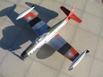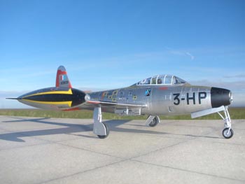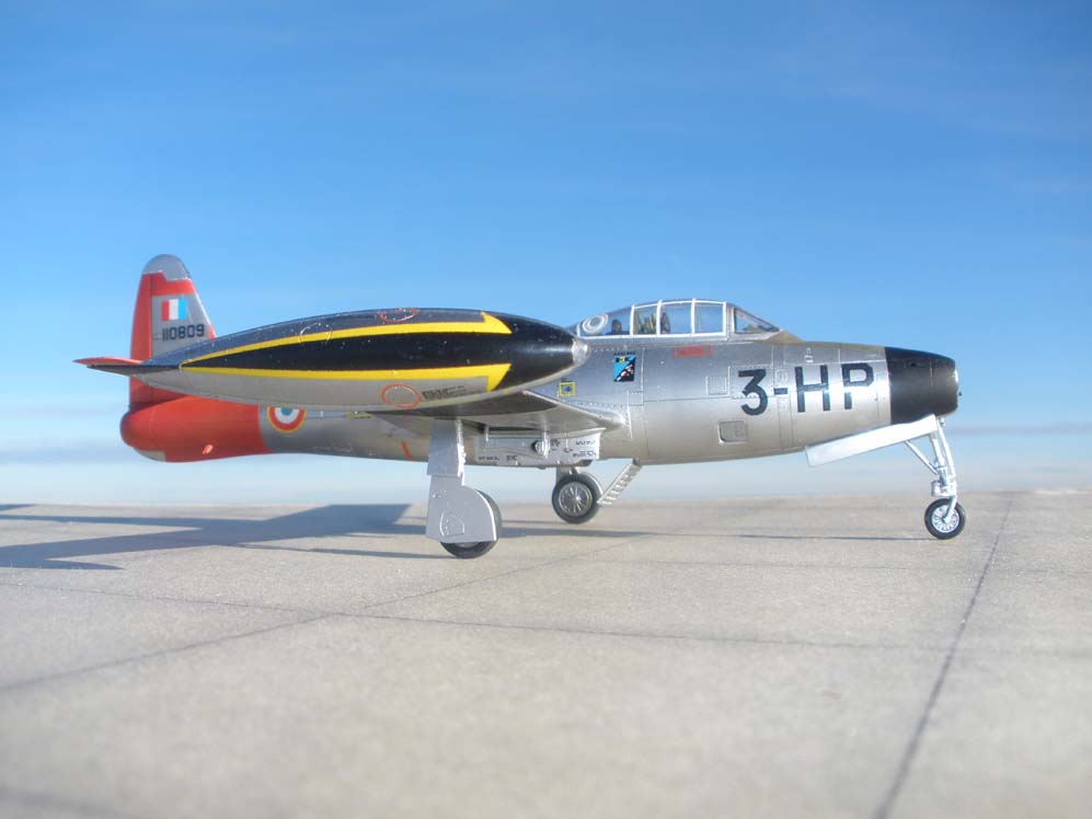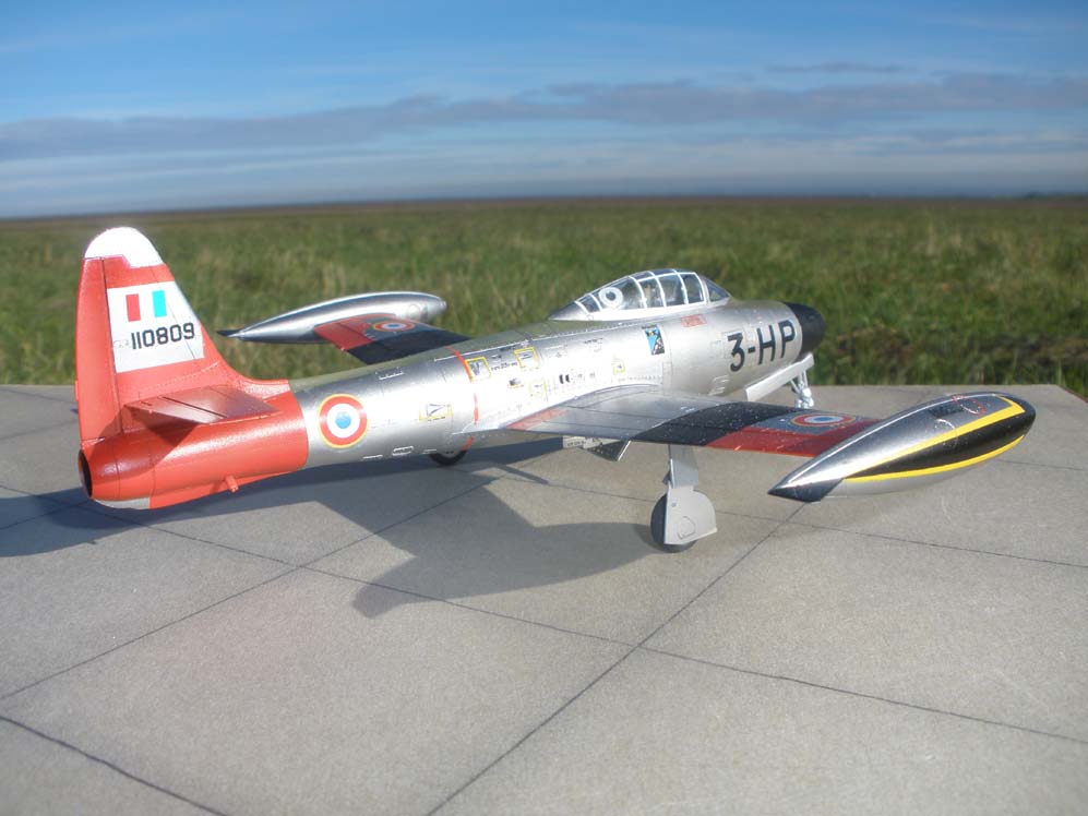 Souhaitant réaliser un F-84G de la Patrouille de France 1953, j’ai jeté mon dévolu sur le 3-HP (110809) qu’on voit en position de leader sur la seule photo que je connaissais de la patrouille en vol. Après avoir soigneusement passé la maquette au Micromesh, j’ai passé l’apprêt gris Alclad. Après une nouvelle passe de Micromesh, j’ai passé de l’Alclad « White aluminium ». J’ai ensuite passé quelques panneaux à l’Alclad « Aluminium ». J’ai passé de façon plus aléatoire diverses tonalités d’Alclad un peu partout pour éviter tout aspect patchwork. Enfin, j’ai passé du white aluminium aux endroits ou se trouvaient auparavant les cocardes américaines pour suggérer un nettoyage avant pose des cocardes françaises qu’on observe sur la photo.