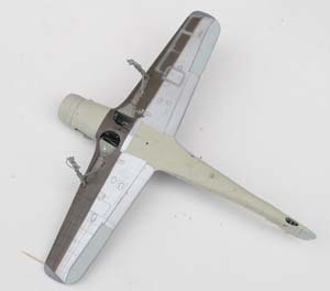 L'avion serait porteur du fameux et très discuté RLM 84 sur les flancs du fuselage (reproduit en mélangeant le Gris IJA Grey Tamiya avec une pointe de RLM 79 Gunze), de RLM 81, 82 et 83 sur le fuselage, tandis que les surfaces supérieures des ailes et stabilisateurs reçoivent du RLM 76 et RLM 81. Pour les surfaces inférieures les ailes sont non peintes sur leur partie principales, tandis que j'ai opté pour le RLM 81 pour une large bande de bord d'attaque, les ailerons étant peint en gris RLM 76, de même d'ailleurs que la dérive. Des mouchetis sont rajoutés sur les surfaces verticales du fuselage, y compris la dérive. Pour finir des retouches RLM 02 (à moins qu'elles n'aient été RLM 76) sont appliquées sur les bords d'attaque des ailes et de la dérive, ainsi qu'en vert foncé (RLM71 ou 70) en pied de dérive. Un apprêt rouge protège certains points du fuselage probablement soumis à l'oxydation.