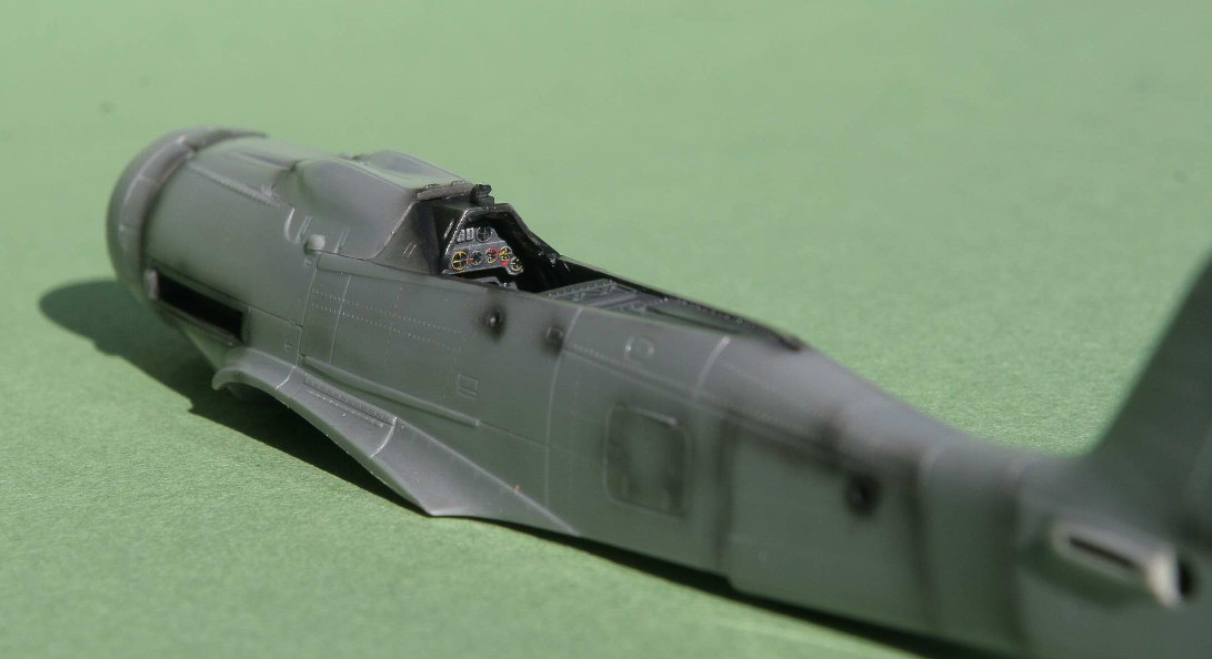 Une fois le sous-ensemble constitué par le cockpit terminé, le fuselage peut être fermé et collé. Le petit moteur, dont nous avions vérifié l'ajustement à blanc est inséré dans son logement par le dessous et collé à l'avant du fuselage.