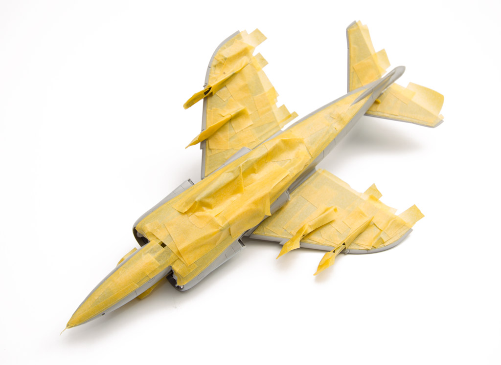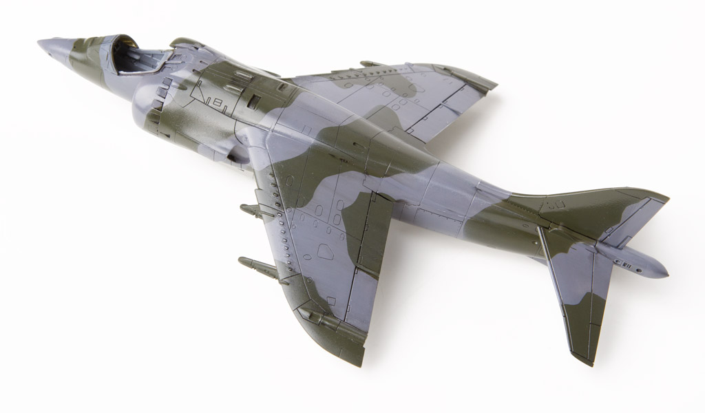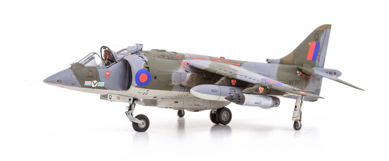 Le Harrier GR1 a eu une carrière opérationnelle très courte, l'avion ayant évolué rapidement vers la version GR3. L'avion apparaît dans la documentation plutôt propre, souvent très brillant. La patine a donc été limitée et seulement les carenages d'antennes olive drab sur la dérive ont été patinés de façon un plus marquée. Les teintes utilisées proviennent de la gamme Gunze, référence H331, H332, et H330.