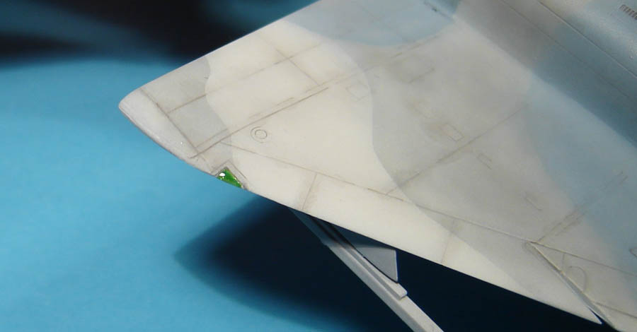 L'emplacement des feux de navigation gauche et droit ainsi que du feu de la dérive sont découpés soigneusement au cutter. Des morceaux de plastique transparent sont collés à la colle fluide Tamiya,