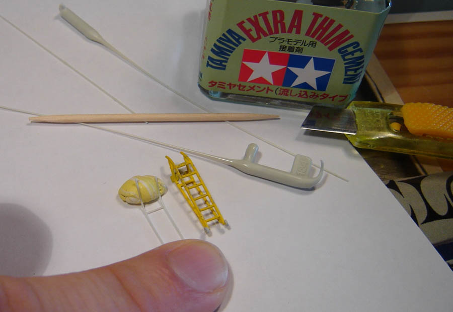 Un premier essai à base de rod Evegreen fut abandonné au profit d’un deuxième essai à base de plastique étiré, plus fin pour le rendu au 1/72ème. La colle extra fluide Tamiya (bouchon vert) est idéale pour ce type de collage.