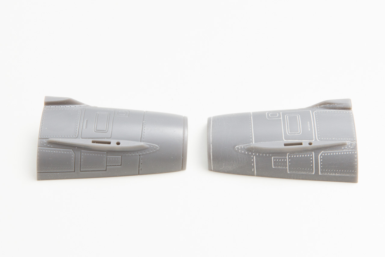 | La gravure sur les entrées d'air est plus prononcée que sur le reste de la maquette. Pour l'atténuer, j'ai passé du Surfacer 500 sur les lignes. Le produit est simplement appliqué au pinceau. Puis, après séchage, l’excédent est poncé. |