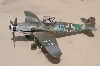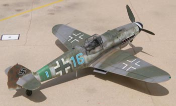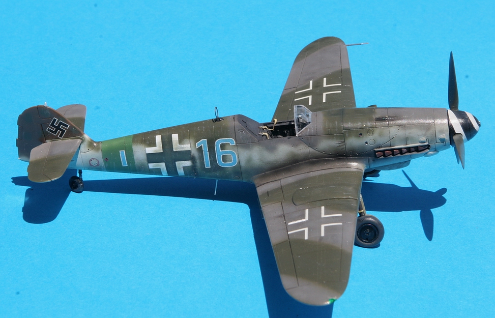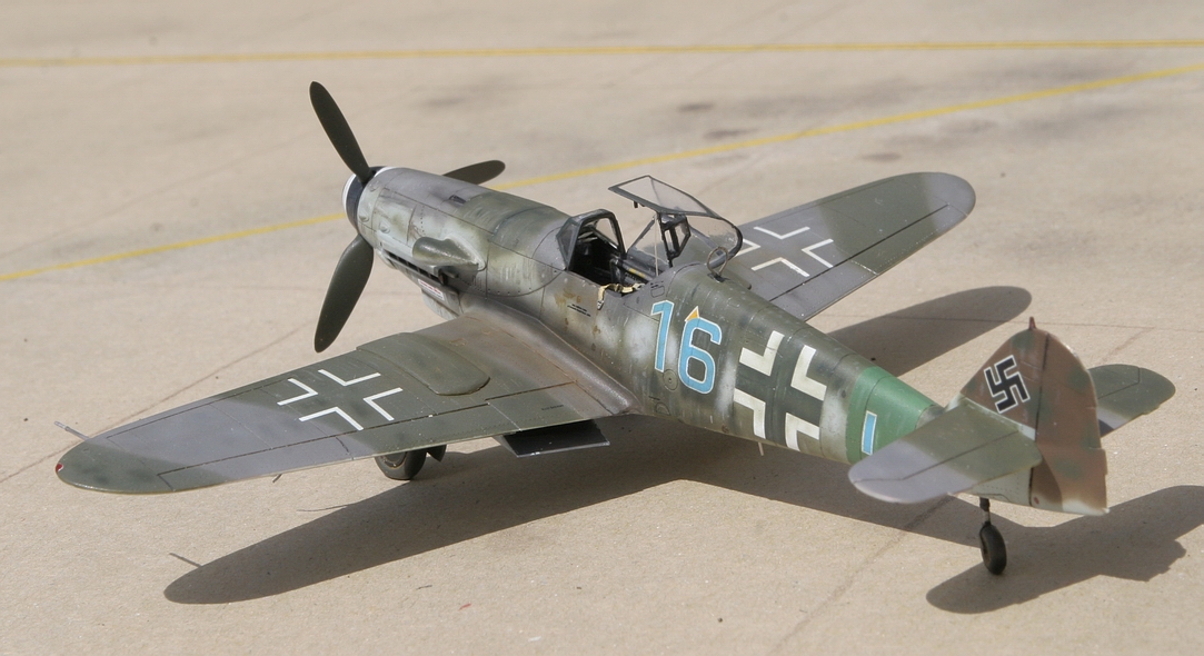 L'idée était de mettre la main sur des couleurs et un type de camouflage peu habituels pour moi. Après avoir mis une première main à un FW190D-9 Tamiya, la seconde tentative ne pouvait concerner qu'un Me109 de fin de série avec autant que possible un camouflage complexe et altéré. Fouillant ma documentation entre des Me109G-10 et K-4, la combinaison de décalques disponibles et d'une belle documentation dans un des livres Japo sur les Me109K m'a fait opter pour le "16 bleu".