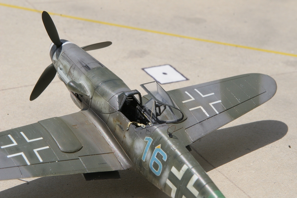 Quelques images valant mieux qu'un long discours et je vous présente en photo l'évolution de la mise en peinture. En premier lieu, j'en suis passé par une consultation patiente de la documentation, qui malgré le temps passé ne me permet pas d'être tout à fait définitif sur le sujet. En particulier il reste une différence d'interprétation des couleurs de la dérive entre la documentation issue du livre Japo sur les 109 Karl et la notice d'instruction de la planche de décalques Eagle Cals, généralement pourtant spécialiste du domaine. Mon interprétation, et la vraisemblance issue de comparaisons d'autres avions de la même série, m'ont poussé à conclure comme Japo à une dérive kaki brun RLM81 mouchetée en rupture avec le reste du camouflage RLM75/83/76. L’avion semble porter un nombre important de traces de réparations et de raccords peinture, à commencer par une touche de RLM83 frais sous certains chiffres du code 16, probablement pour couvrir un ancien numéro d’identification. Le camouflage set réalisé à main levée, sauf sur les ailes où je me suis aidé de boudins de pate à modeler. La pose de décalques se fait simplement avec utilisation de produit assouplissant mais sans sous couche de vernis brillant. Le reste est un travail de patine en mixant des effets à partir de peinture à l’huile, terre à décors, feutre indélébile fin, voiles de peinture très diluée.