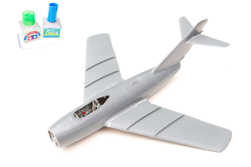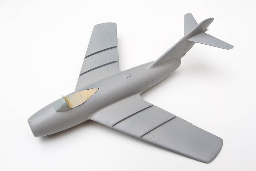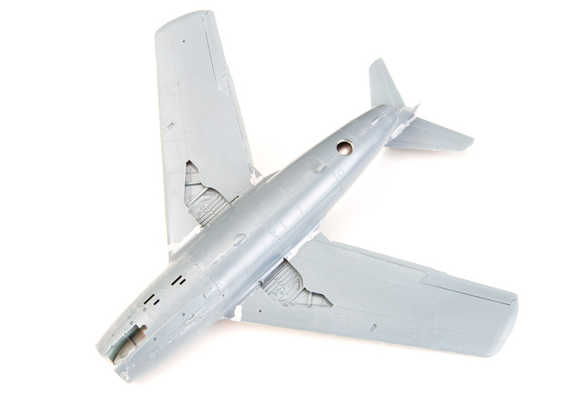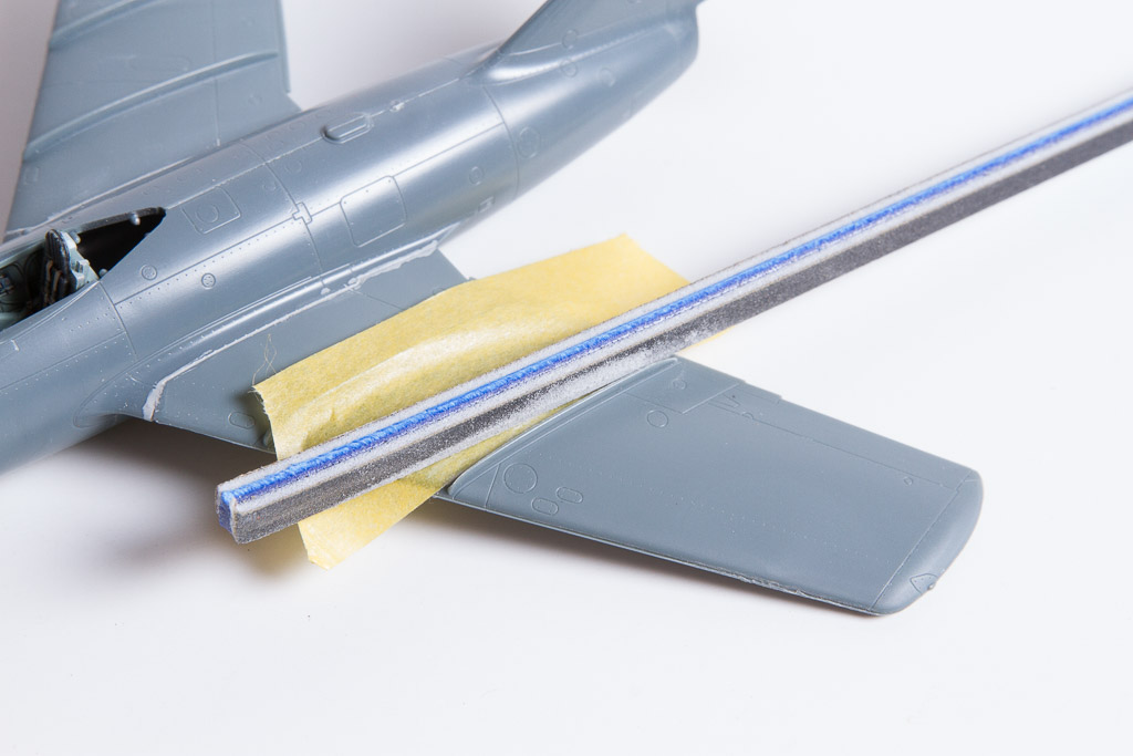 la maquette mise en croix, j'ai placé du plastique étiré entre le fuselage et les ailes, l'espace n'était pas large mais la voilure ne tenait à pas grand chose. Puis passage au Surfacer.