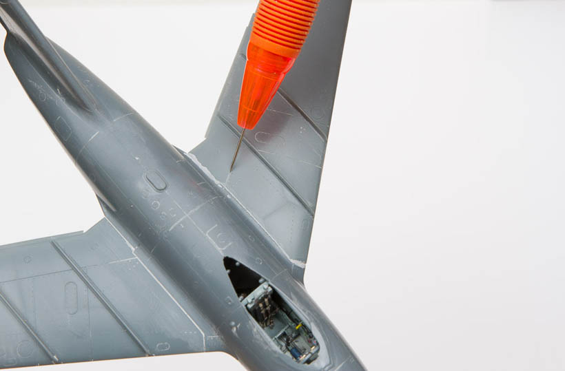 Initialement j'avais envisagé de faire tout le rivetage, j'ai commencé à faire des essais mais finalement en consultant la documentation je me suis ravisé. Sur les avions opérationnels les rivets paraissent pour ma part moins voyants que sur les avions dans les musées qui servent souvent de base pour la documentation et qui peuvent nous induire en erreurs sur notre interpretation du rendu des rivets et têtes de vis. D'ailleurs bien souvent il ne s'agit pas de rivets mais de vis à embouts cruciforme...