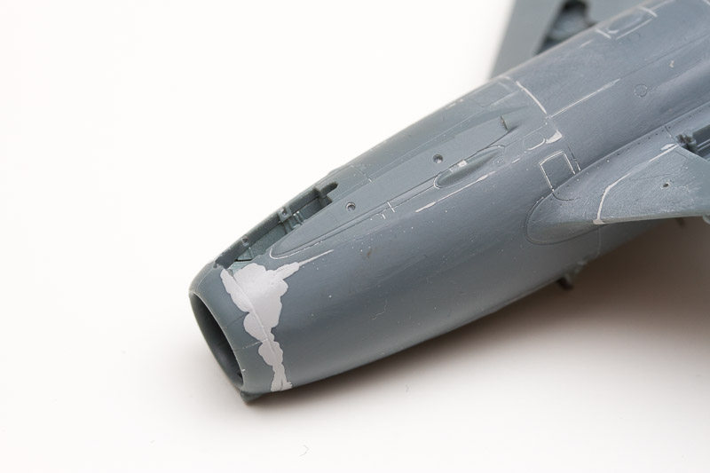 | Je n'ai pas été très bon dans l'alignement de la plaque au niveau des canons avec un petit décalage que j'ai du rattraper, par contre l'assemblage du nez n'est pas parfait même en s'appliquant du mieux possible pour l'alignement avec le fuselage. Mais il y a tout de même du travail pour mastiquer/poncer à ce niveau... |