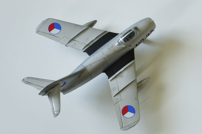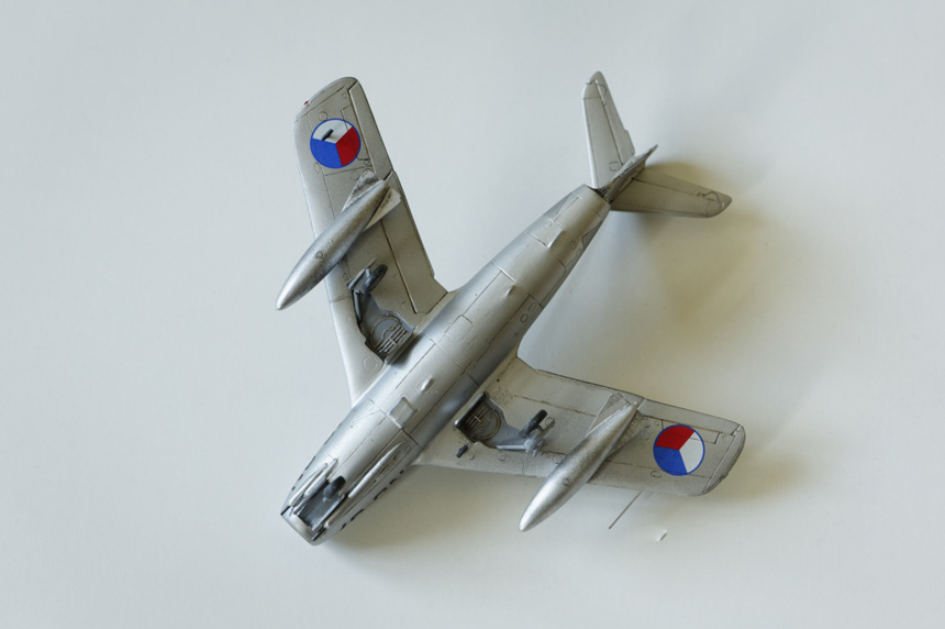 La décoration du modèle était tout autre à l'origine du projet. Mais la planche de décalques que je possédais ne proposait que des 15Bis à ma grande surprise. Après recherches, je me suis aperçu qu'il n'y avait pas beaucoup de propositions pour un MiG 15. Dans le projet de monter d'autres versions de Fagot, j'ai acheté la boîte Dual Combo Eduard qui proposait entre autres un joli Fagot tchèque célèbre pour avoir abattu un Thunderjet durant la guerre froide. Cà ne rigolait pas à l'époque ! La pose des décalques est très agréable et réagit bien à l'assouplissant Microsol. Auparavant j'ai verni l'ensemble de la maquette avec du Klir. J'ai testé un nouveau vernis qui m'a donné entière satisfaction sur le FJ-4 Fury. Il s'agit du vernis satiné MRP 126. Il casse suffisament le brillant métallique qui ne correspond pas aux avions opérationnels en service depuis quelques années. Attention car cette peinture emploie un diluant très costaud qui a dissoud la peinture des réservoirs supplémentaires non protégés par une couche de Klir.Tant pis ils resteront en l'état !