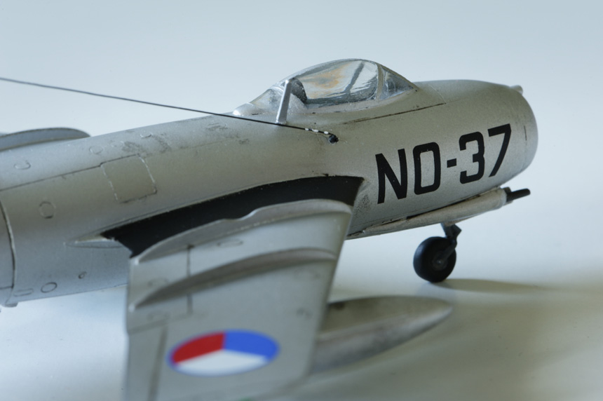 Côté finition, j'ai remplacé les canons les plus fins par des morceaux de seringue, limé le gros canon pour plus de netteté et au passage je l'ai percé pour plus de réalisme. Il serait préférable de le remplacer également mais je ne possédais rien de son diamètre. Il a fallu renforcer comme d'habitude la fixation des trains d'atterrisage principaux et le mât d'antenne dorsal avec de la corde métallique à guitare, ce qui m'a valu un nouvel écueil. J'ai percé l'intrados des ailes avec mille précautions pour recevoir le bout métallique dépassant des fûts des trains et obtenir ainsi une meilleure fixation. Seulement l'épaisseur de l'aile est si fine que j'ai réussi à transpercer la surface extrados des ailes au moment de la fixation des trains. Oh de très très peu, mais suffisant pour voir apparaître des petites bosses. Opération sauvetage alors que peinture et déco étaient déjà réalisées. Finalement la première séance de rattrapage de peinture m'a bien servi pour éviter la même erreur. Dernière touche avant la séance photo, la mise en place de l'antenne filaire fabriquée en plastique étiré. Un coup de forêt 0,3mm sur le haut de la dérive avec insertion d'un bout du fil plastique collé à la cyano. Perçage et insertion d'un morceau d'aiguille métallique sur le fuselage avant de coller le fil plastique sans trop le tendre pour ne pas le rompre. La tension de ce dernier s'effectue avec une source de chaleur genre fer à souder. Il suffit d'approcher l'outil chaud le long du fil et le plastique se rétracte comme par magie. Un coup de peinture noir anthracite sans trop appuyer avec le pinceau et le tour est joué. Trois petites gouttes de colle blanche représentent les isolateurs blancs.