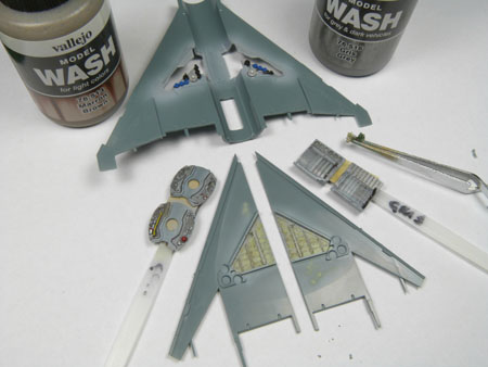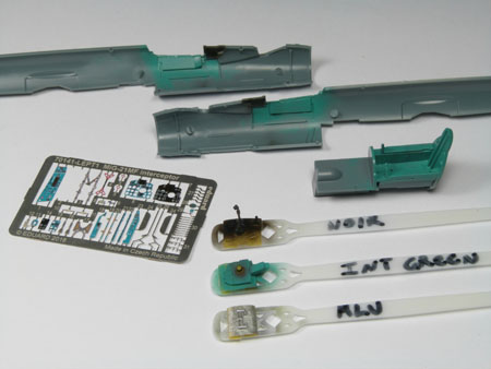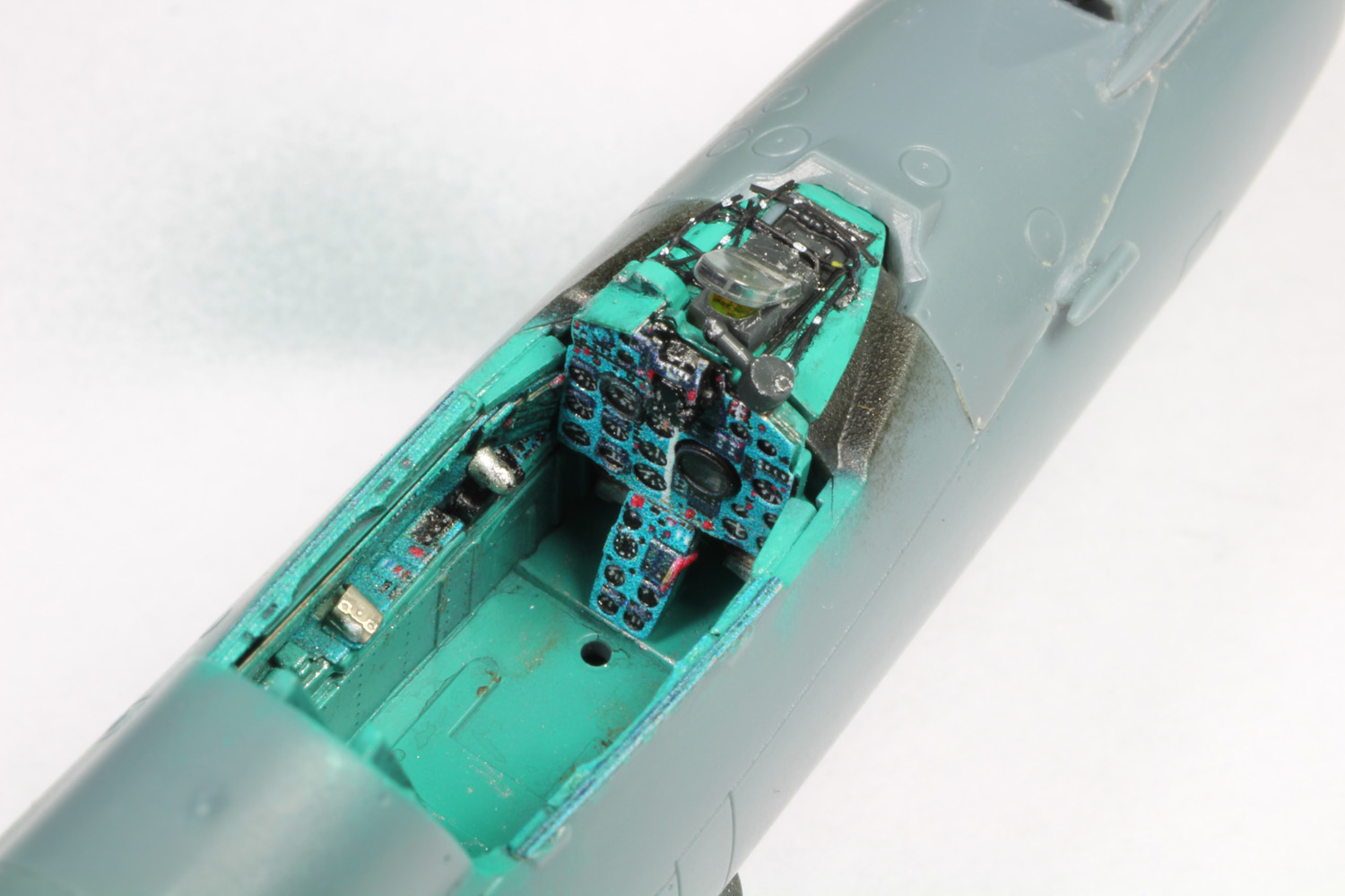 Les instruments sur les consoles et les palonniers sont collés, le cockpit commence à gagner en couleurs.