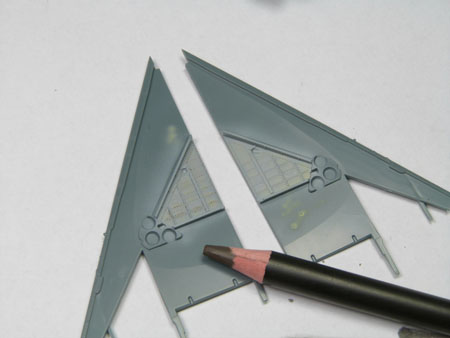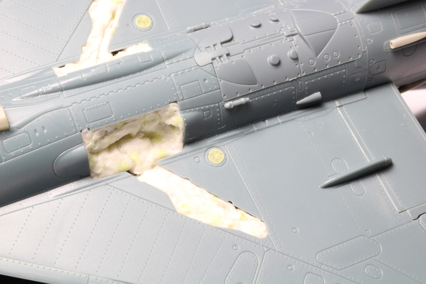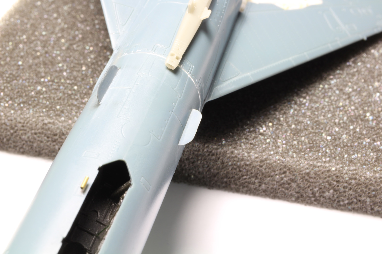 - Une des dernières choses à coller avant la peinture sont les ailettes latérales à l'avant de l'avion. Elles ont été