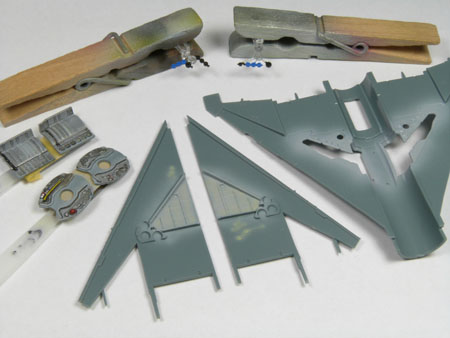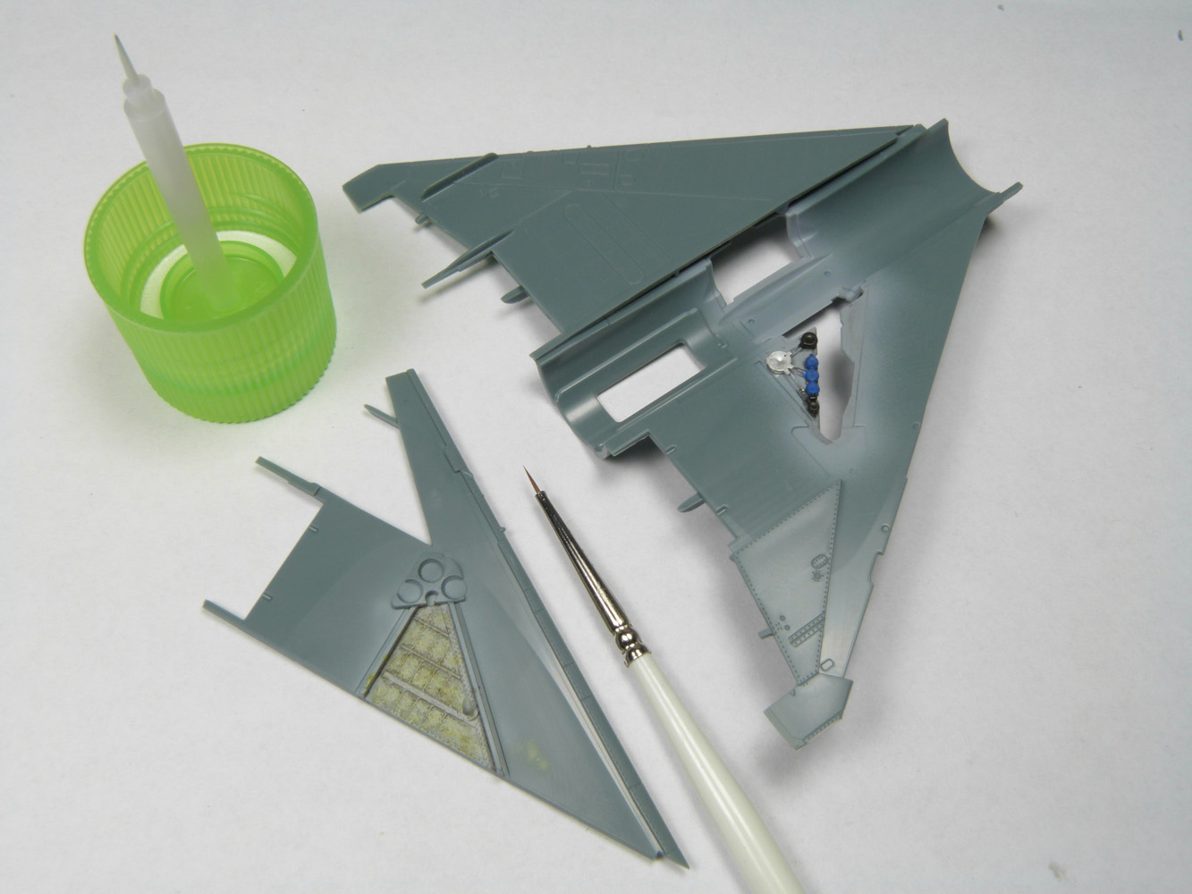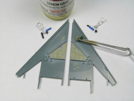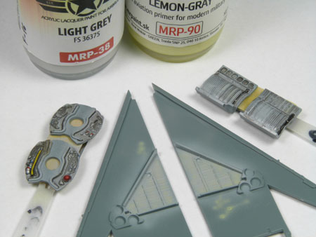 - L'intérieur des ailes sont également peintes avec le même gris. Les pièces E2 et E12 sont peintes au pinceau en bleu et noir