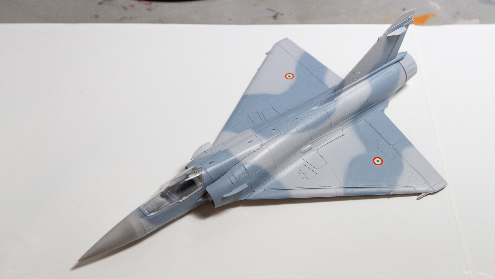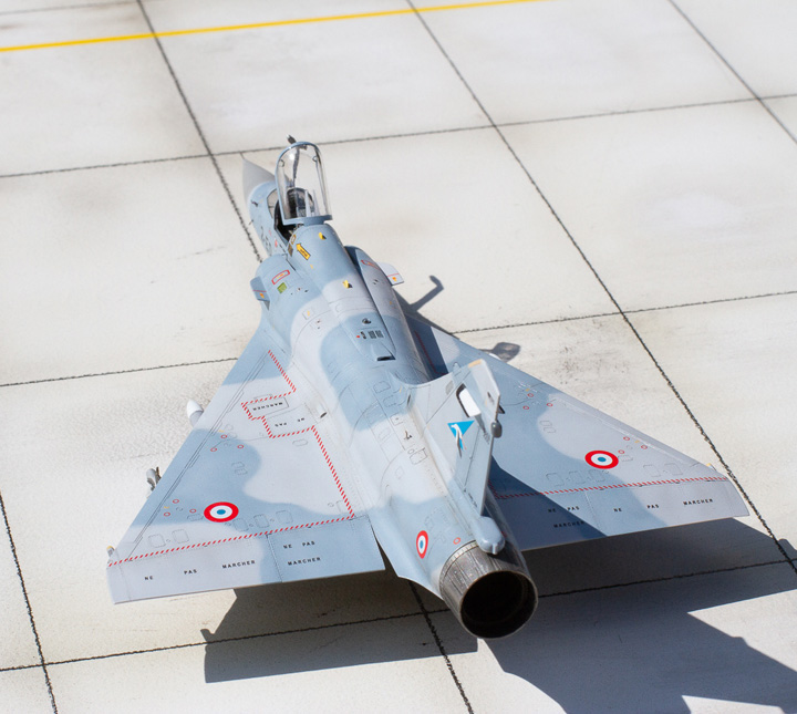 Du vernis brillant a été appliqué uniquement sur les décals, la totalité de la maquette ayant été recouverte ensuite du vernis matt MRP. Dans la réalité, de manière générale, on peut remarquer que la peinture du Mirage 2000 n'est pas matt. Le bleu est plutôt légèrement satiné, le gris légèrement matt et le nez matt. Pour essayer de reproduire cela sur le kit, j'ai très légèrement lustré les parties bleues avec un chiffon doux.