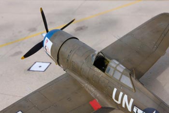 Pour les deux avions la première étape consiste en l’application d’un jus sombre dans les lignes de structures. Sur l’avion camouflé, l’étape suivante a consisté à créer des effets de couleurs différentes, en fonction des panneaux, sur les teintes du camouflage principal. Puis des variations des teintes de base ont donc été vaporisées avec des petits jets nerveux. L’effet recherché est de casser la monotonie des surfaces. Des éraillures assez discrètes de peinture sont réalisés en couleur aluminium, l’avion étant vu en 1942, relativement peu de temps après son arrivée en Angleterre. Quelques traces huileuses sont ensuite faites autour du moteur.