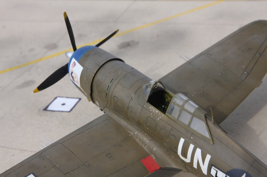 Le premier jeu a été de déterminer la décoration que je souhaitais représenter. Disposant d'un grand nombre de planches de décalques pour le P-47 je savais ne pas avoir de soucis à ce niveau. La pin up de la planche Tamiya, fine et bien reproduite dans la texture des couleurs a même failli remporter mon adhésion. J'ai finalement trouvé un avion assez semblable, portant également une pin up fameuse selon un dessin original d’Alberto Varga, très joliment réalisée dans la réalité et très fine en décalque sur une planche de marque Zotz référence 72024. L’avion est un P-47D codé UN*S du 63rd FS du fameux 56th FG basé en Angleterre en 1942. La décoration Pacifique avec ses larges parements jaune est, elle, issue d'une intéressante planche Superscale référence 72-831 pour un avion codé 238 appartenant au 78th FS du 15th FG.