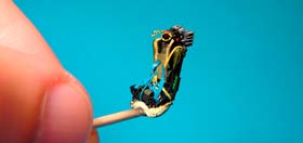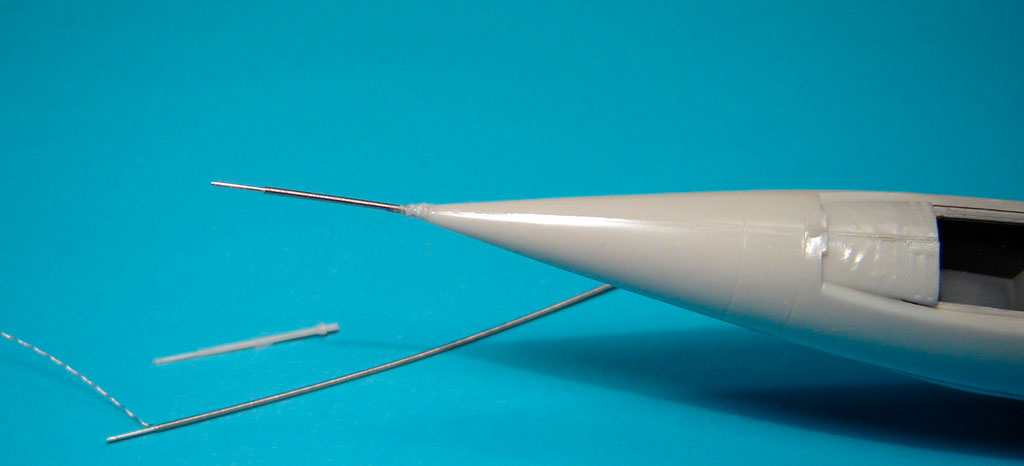Le tube d'hasegawa est substitué par un bout de corde de guitare électrique, partiellement dénudée (corde de Ré). Pour sa bonne jonction avec le radome, du plastique étiré est enroulé autour du point de jonction puis fondu à la colle à maquette.