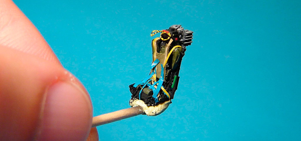 J'ai tenté d'enrichir le siège avec des bandelettes de bande cache Tamiya, pour représenter le système complexe du harnais de ce type de siège.